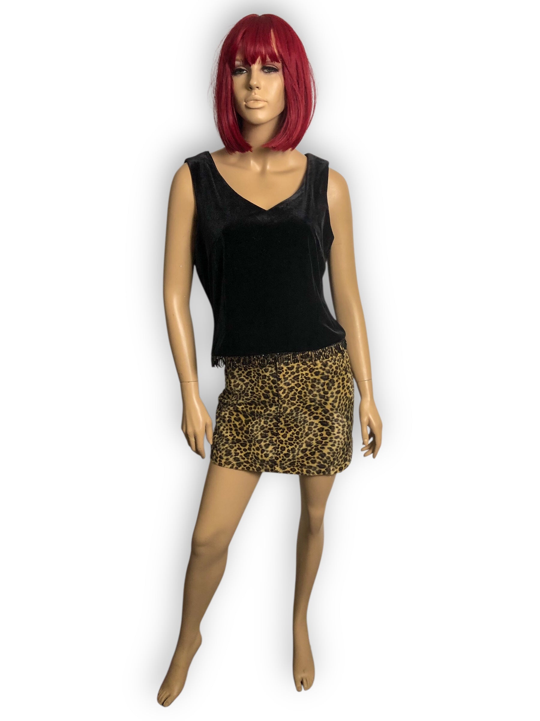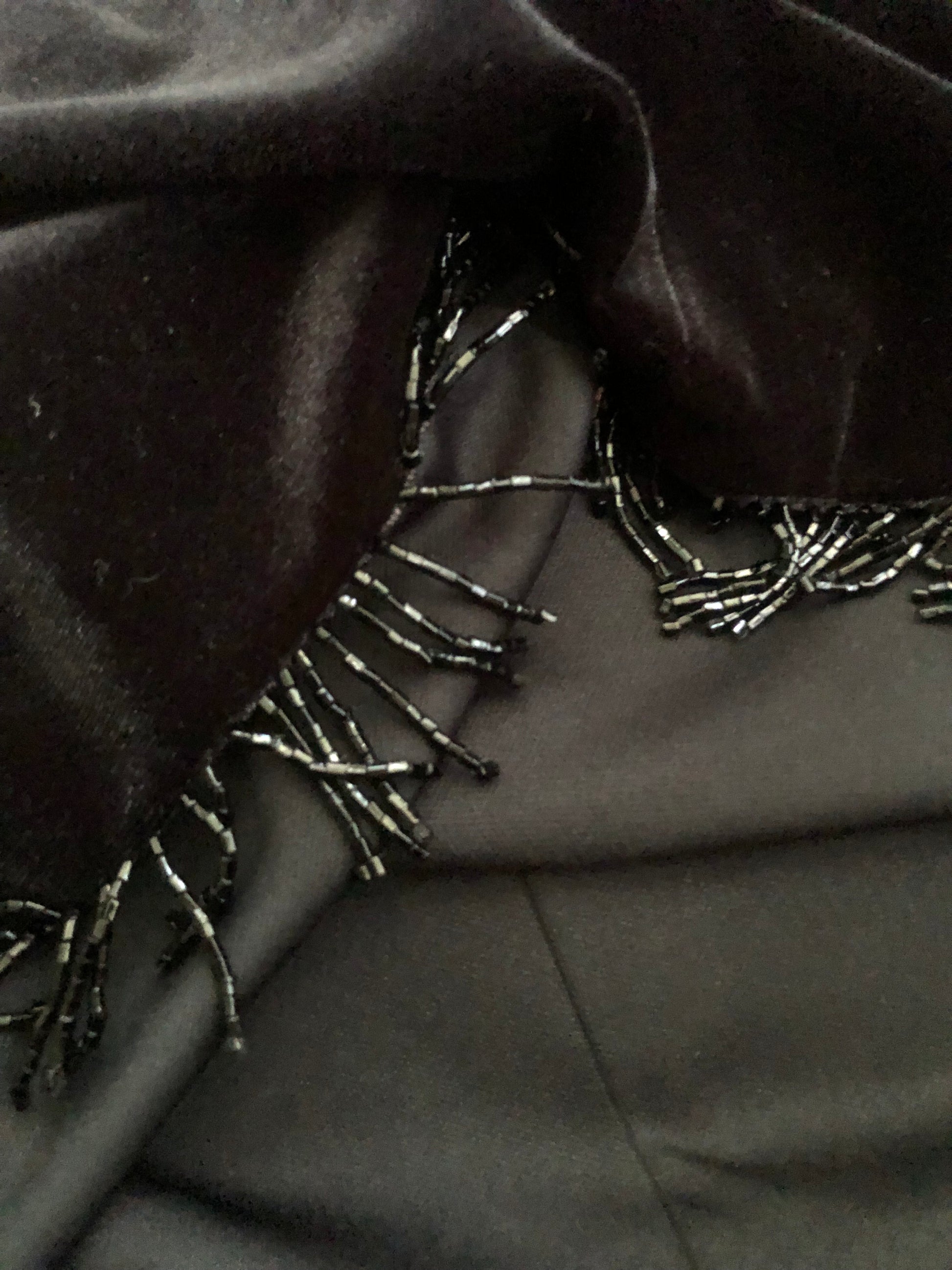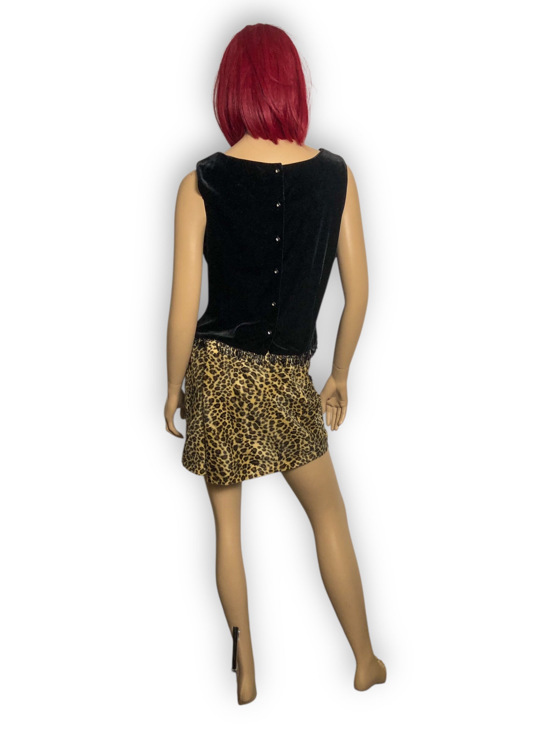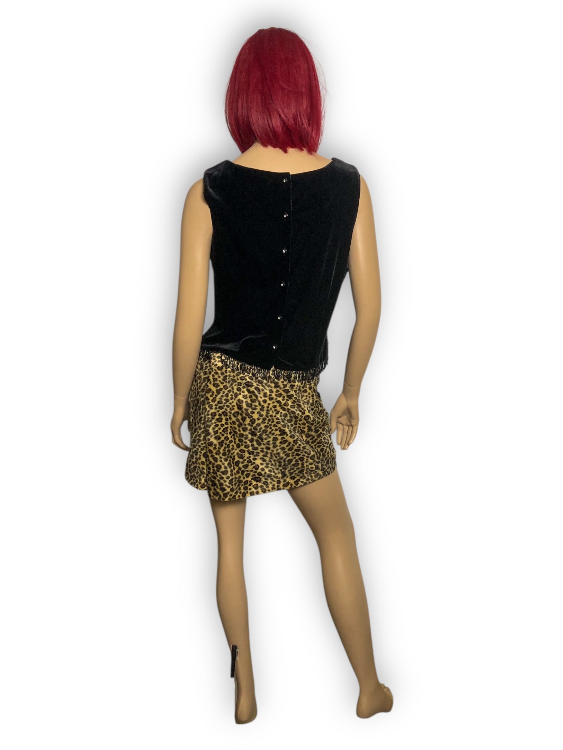 fancy goth going-out top! cute beaded fringe along the bottom hem, chunky rhinestone buttons down the back, polyester lining, some stretch (90% polyester 10% spandex)