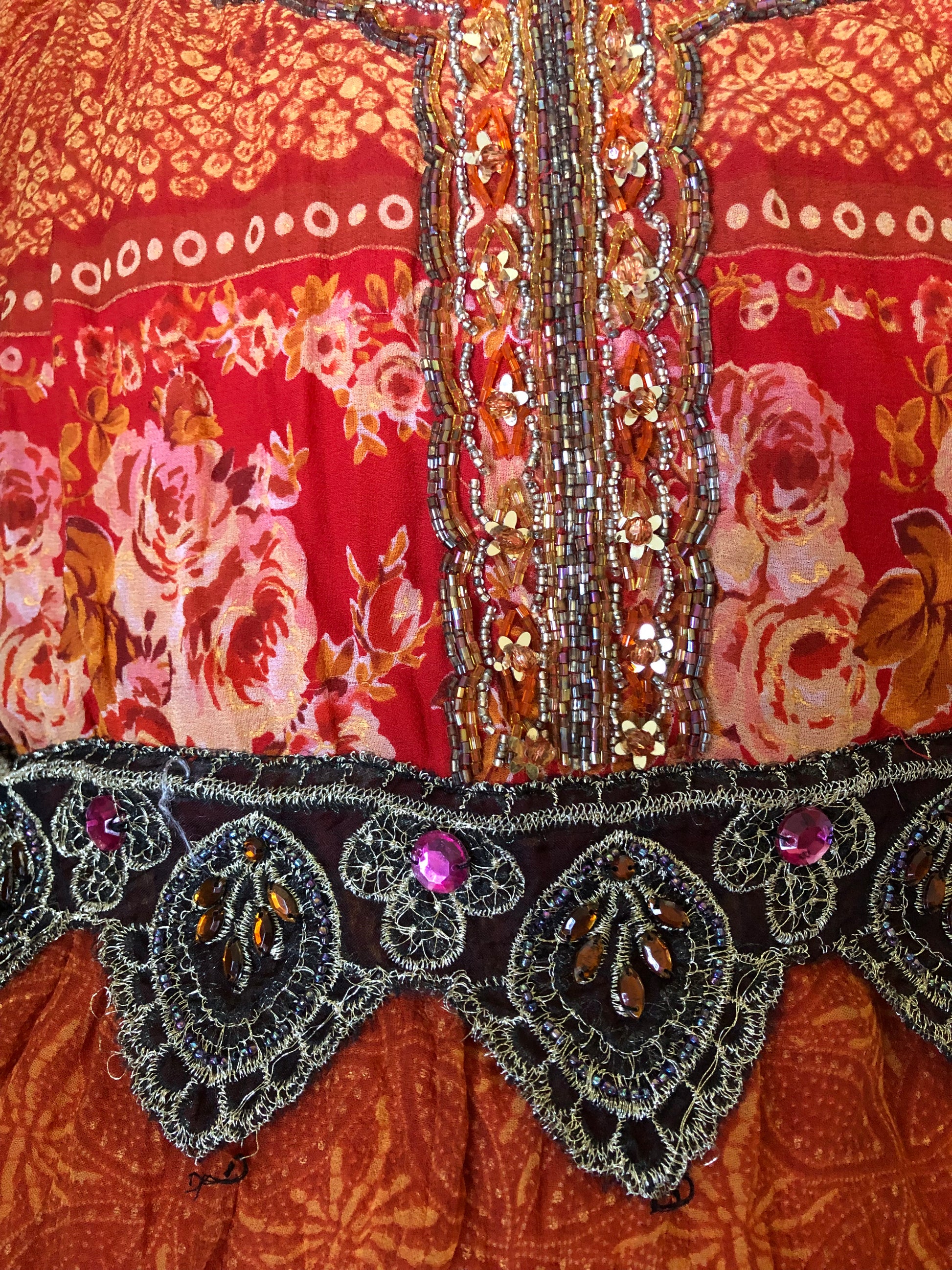 gorgeous summery boho statement piece! colorful beading along the neckline + around the waist, polyester lining, invisible side zipper, pretty floral + geometric design on lightweight mesh (100% silk shell)