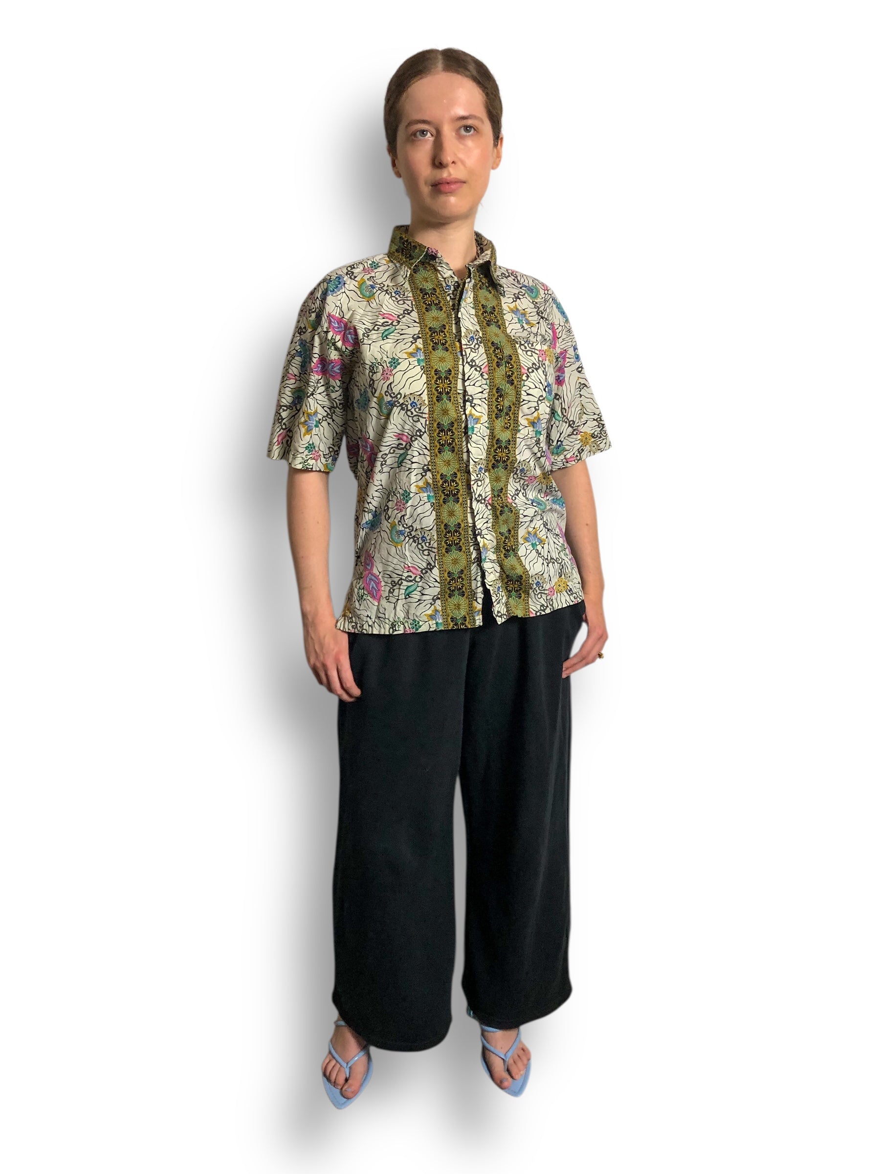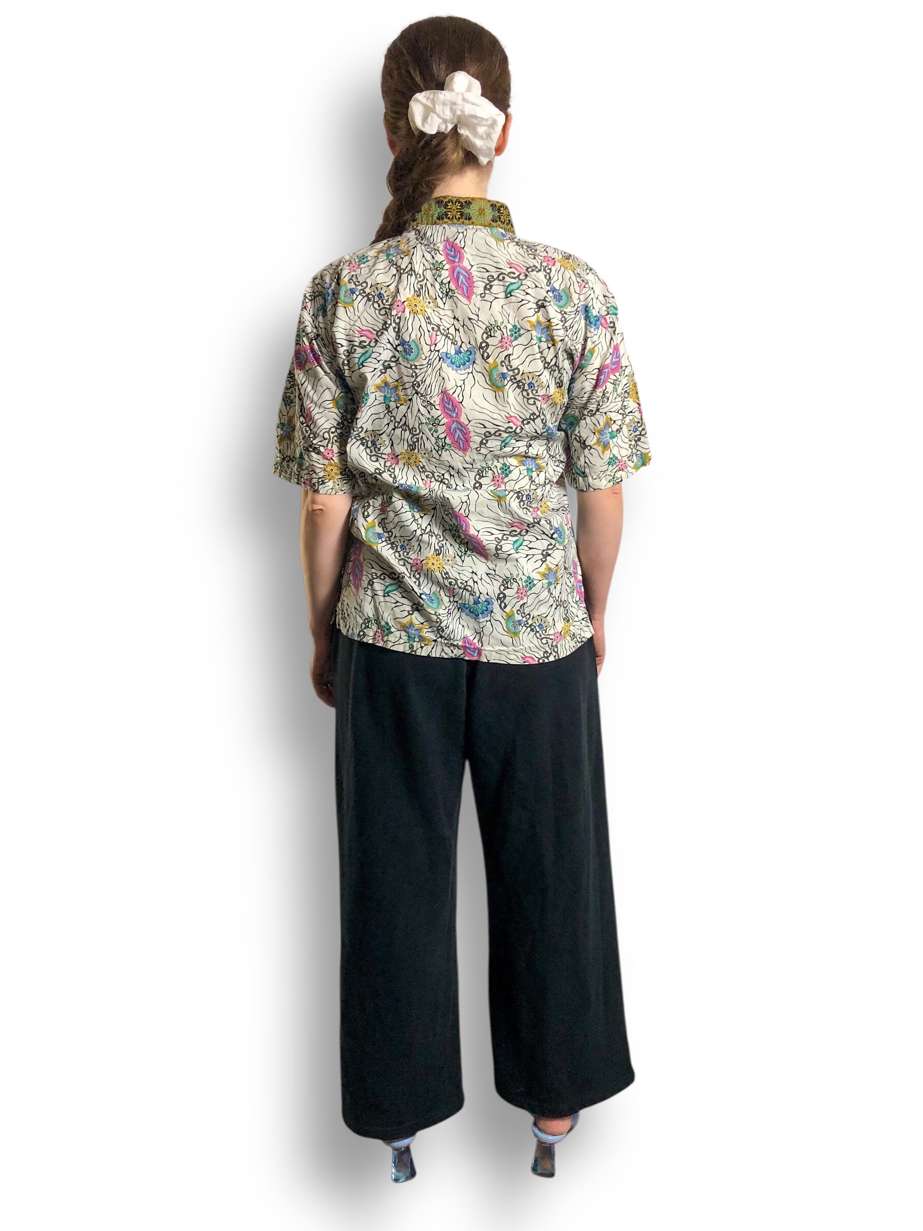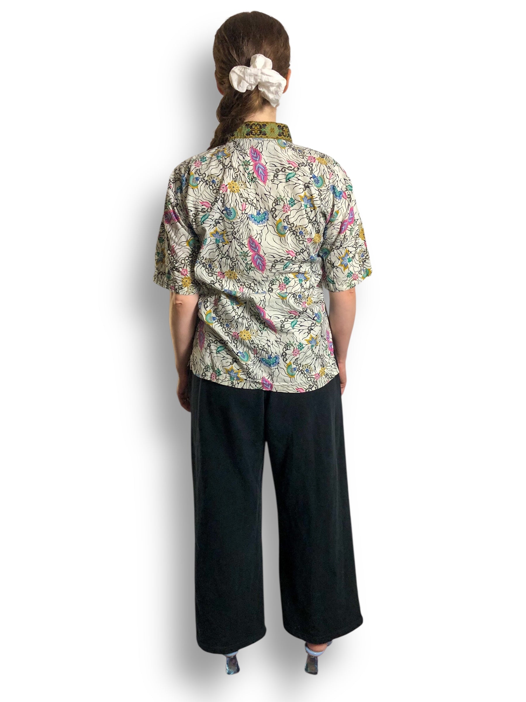 colorful floral designs mixed w/ black cybersigilism <3 crisp collar, feels like cotton (no stretch)
