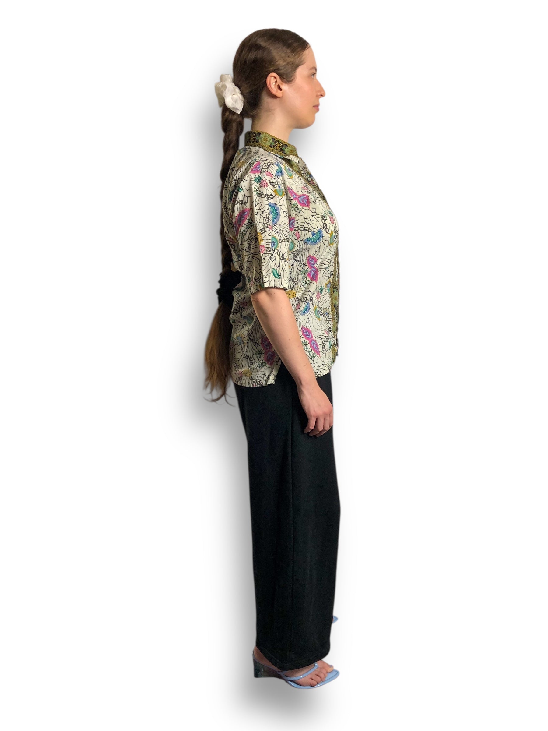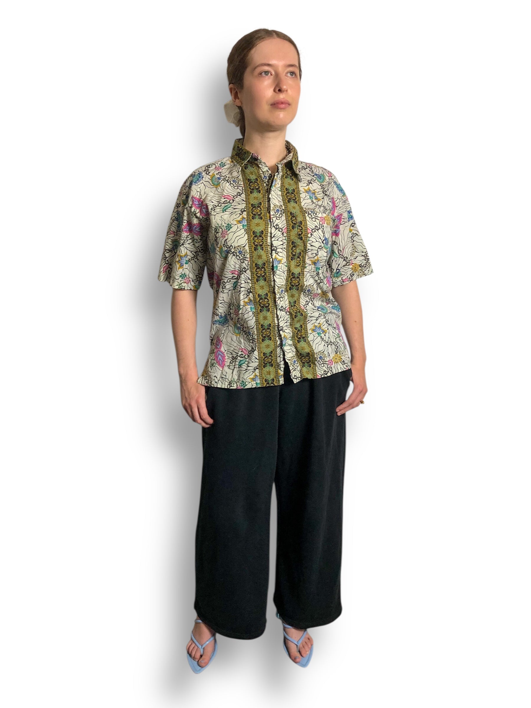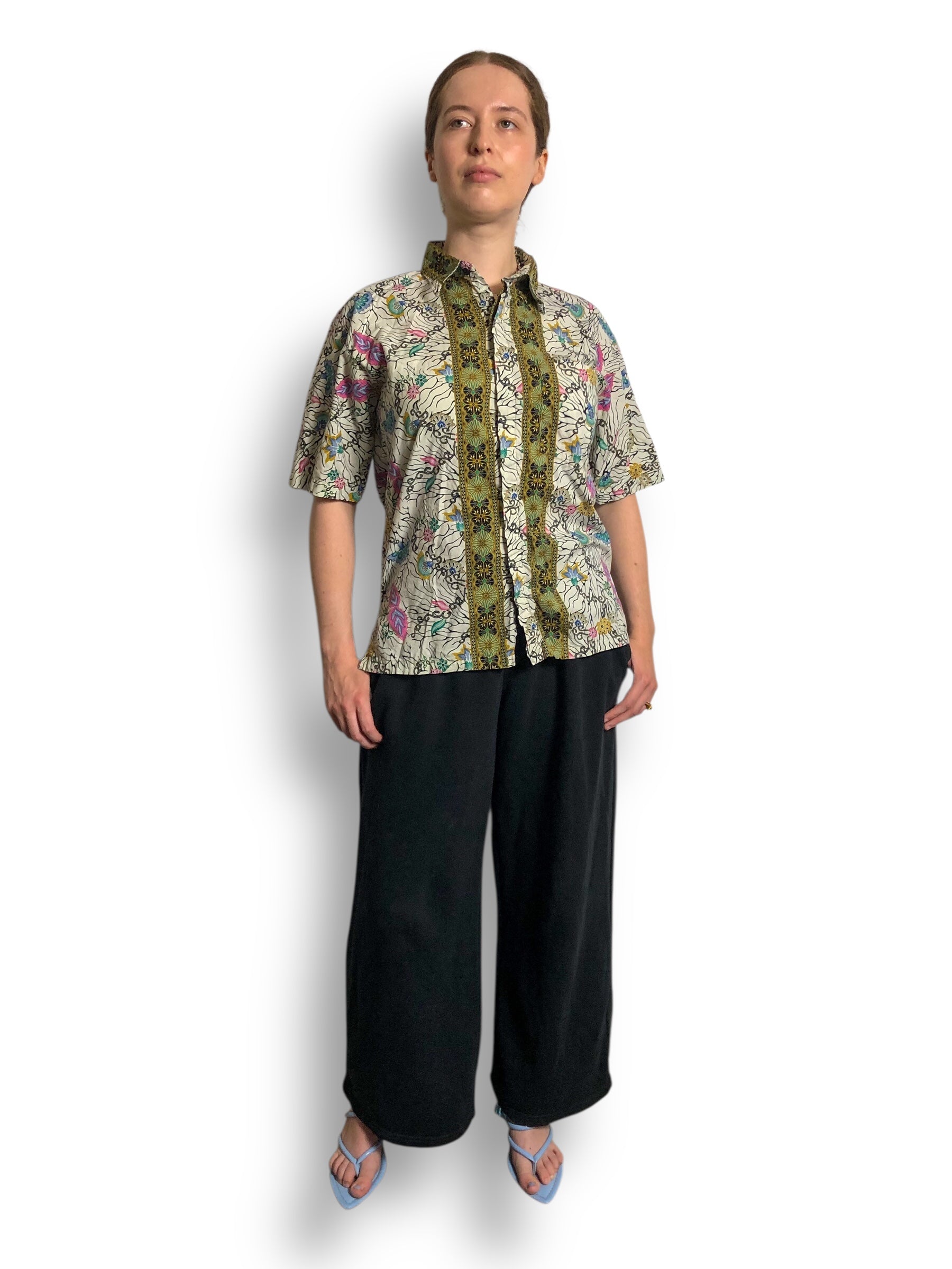 colorful floral designs mixed w/ black cybersigilism <3 crisp collar, feels like cotton (no stretch)