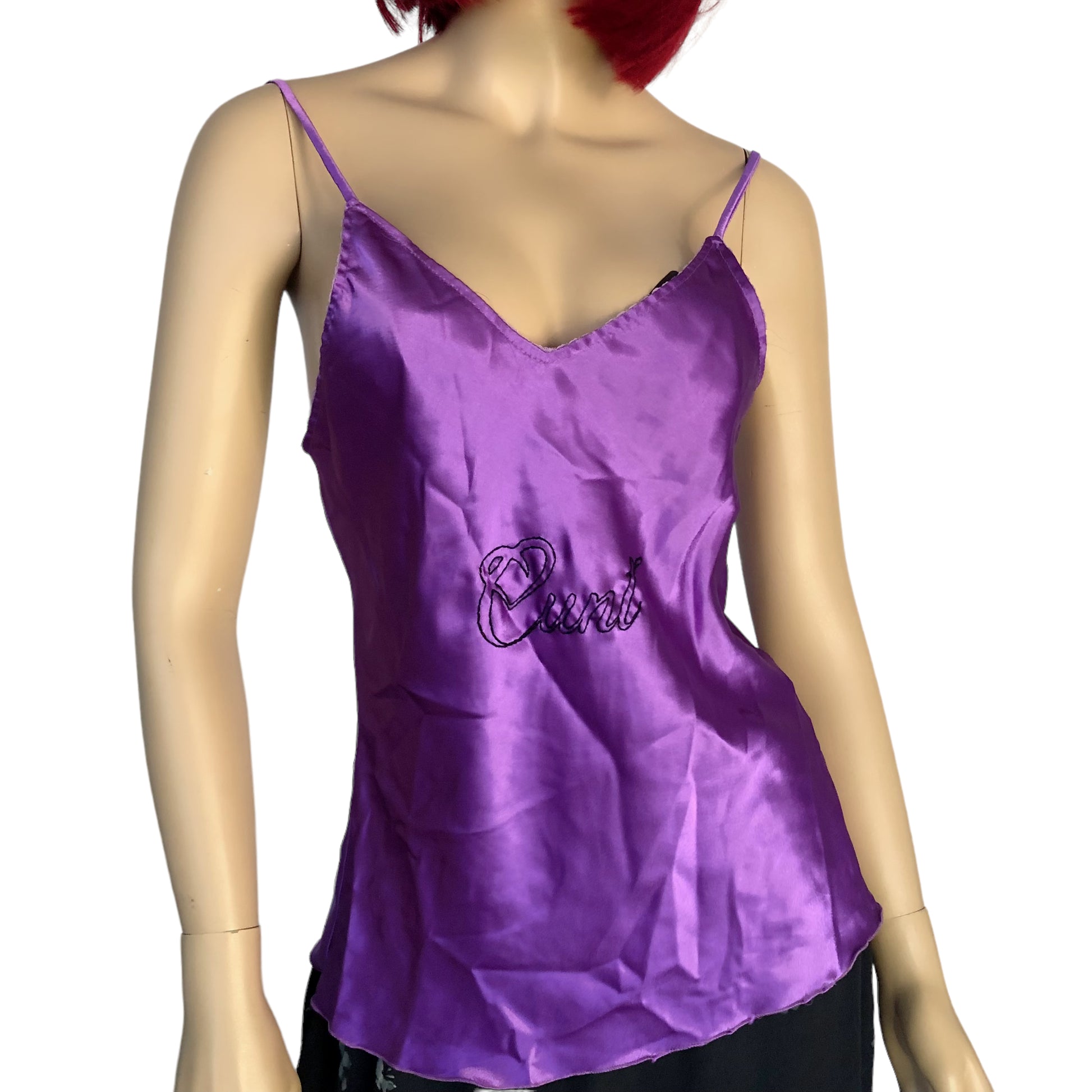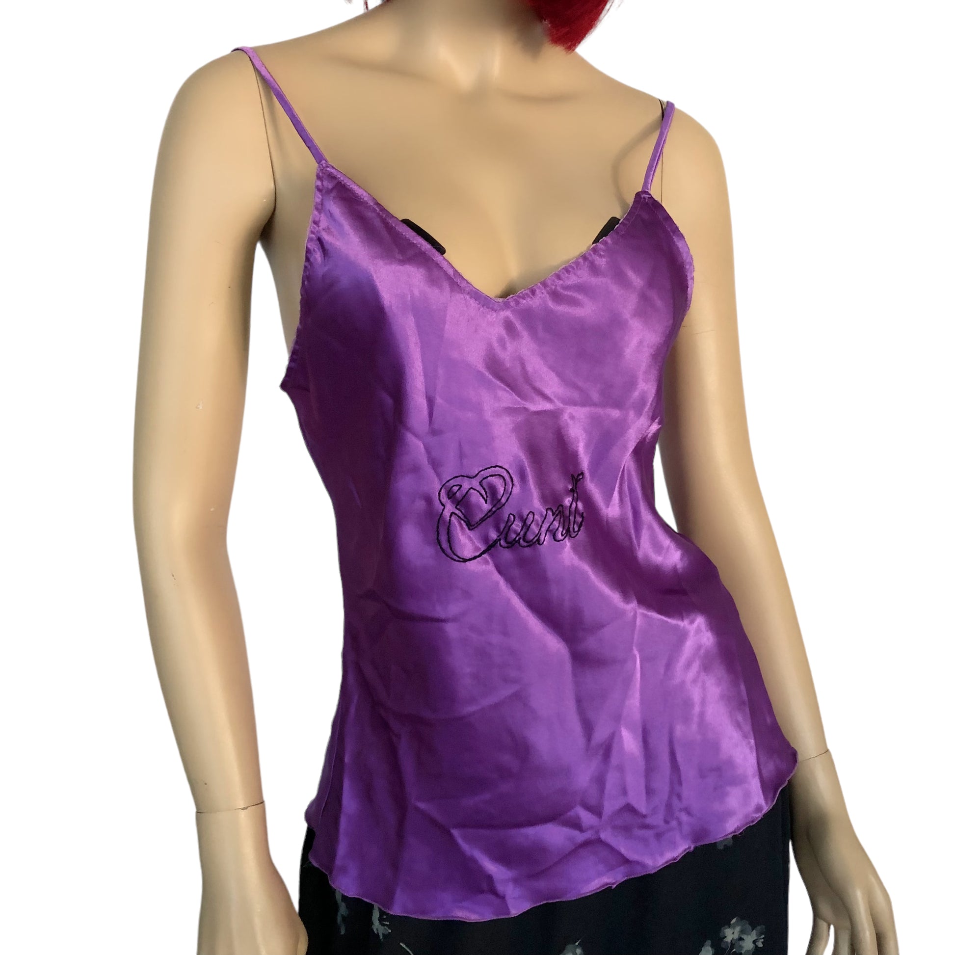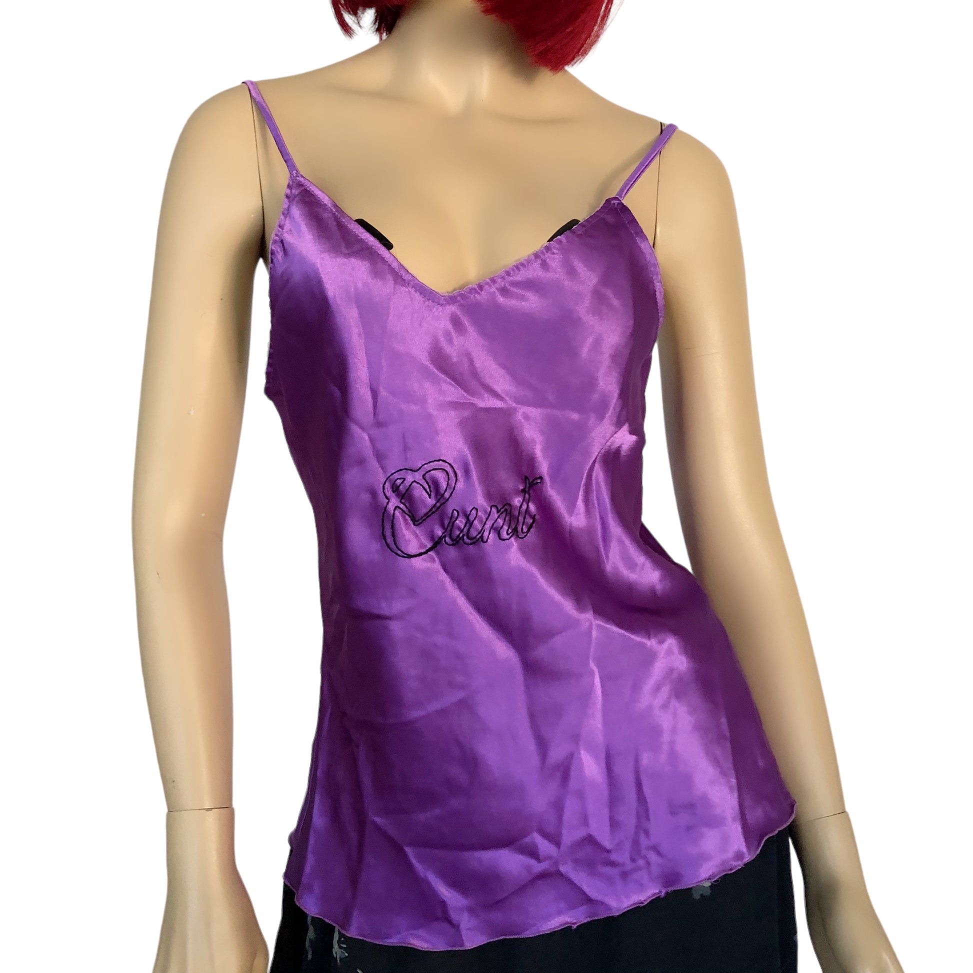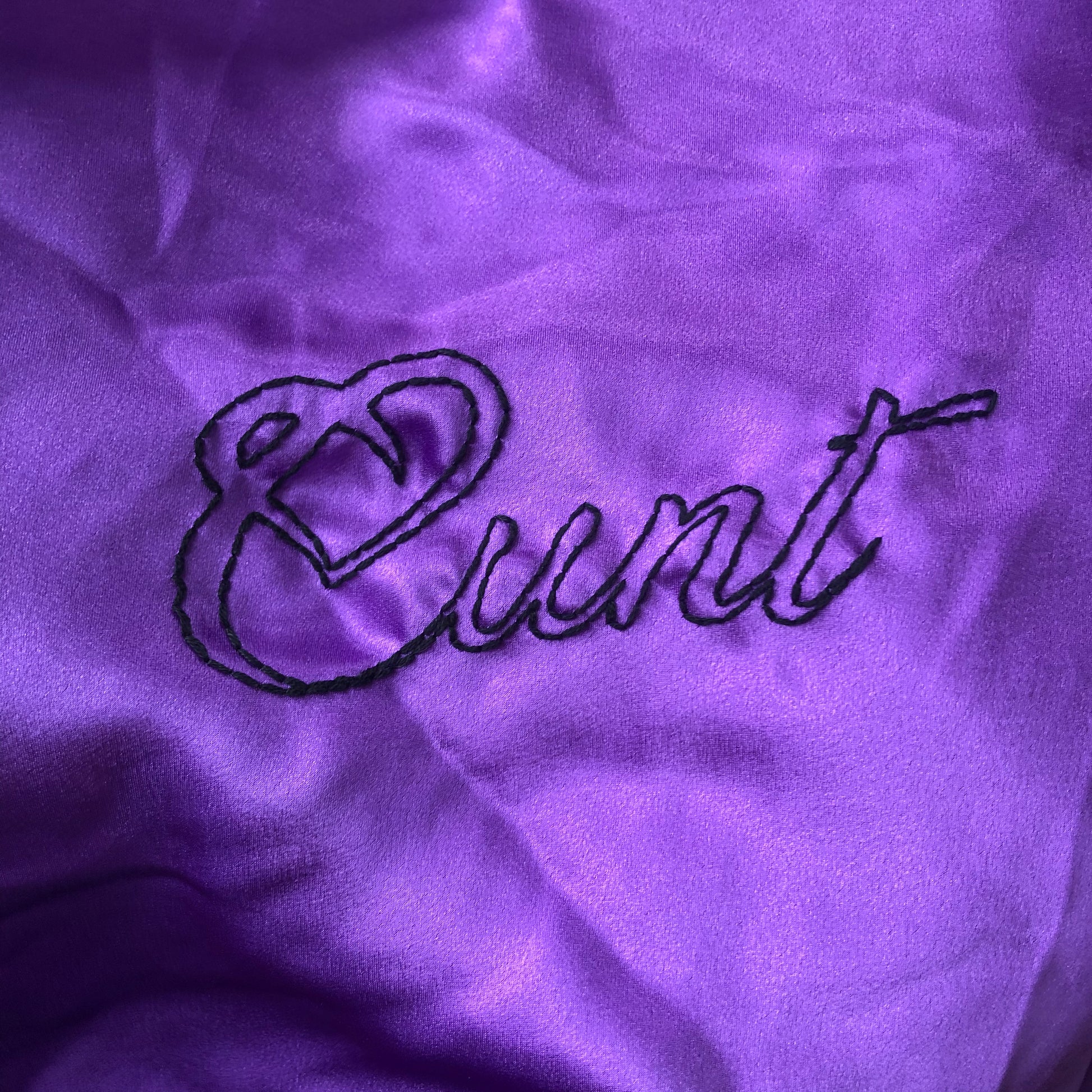 black hand embroidered text by me <3 on a vintage top, little to no stretch