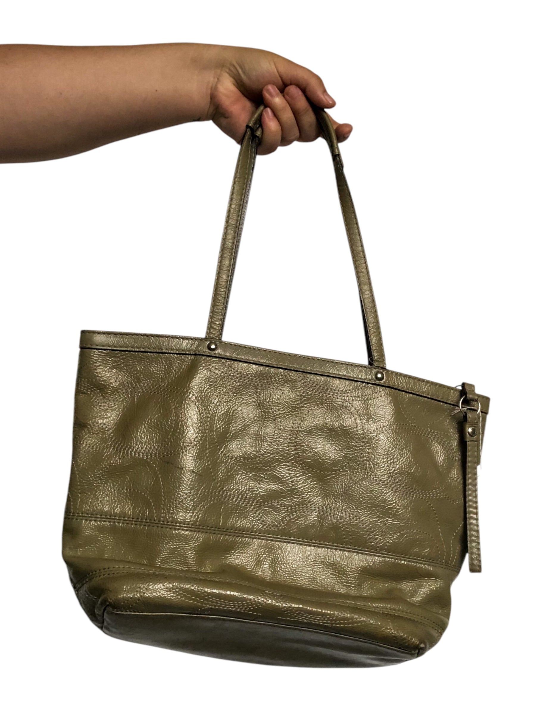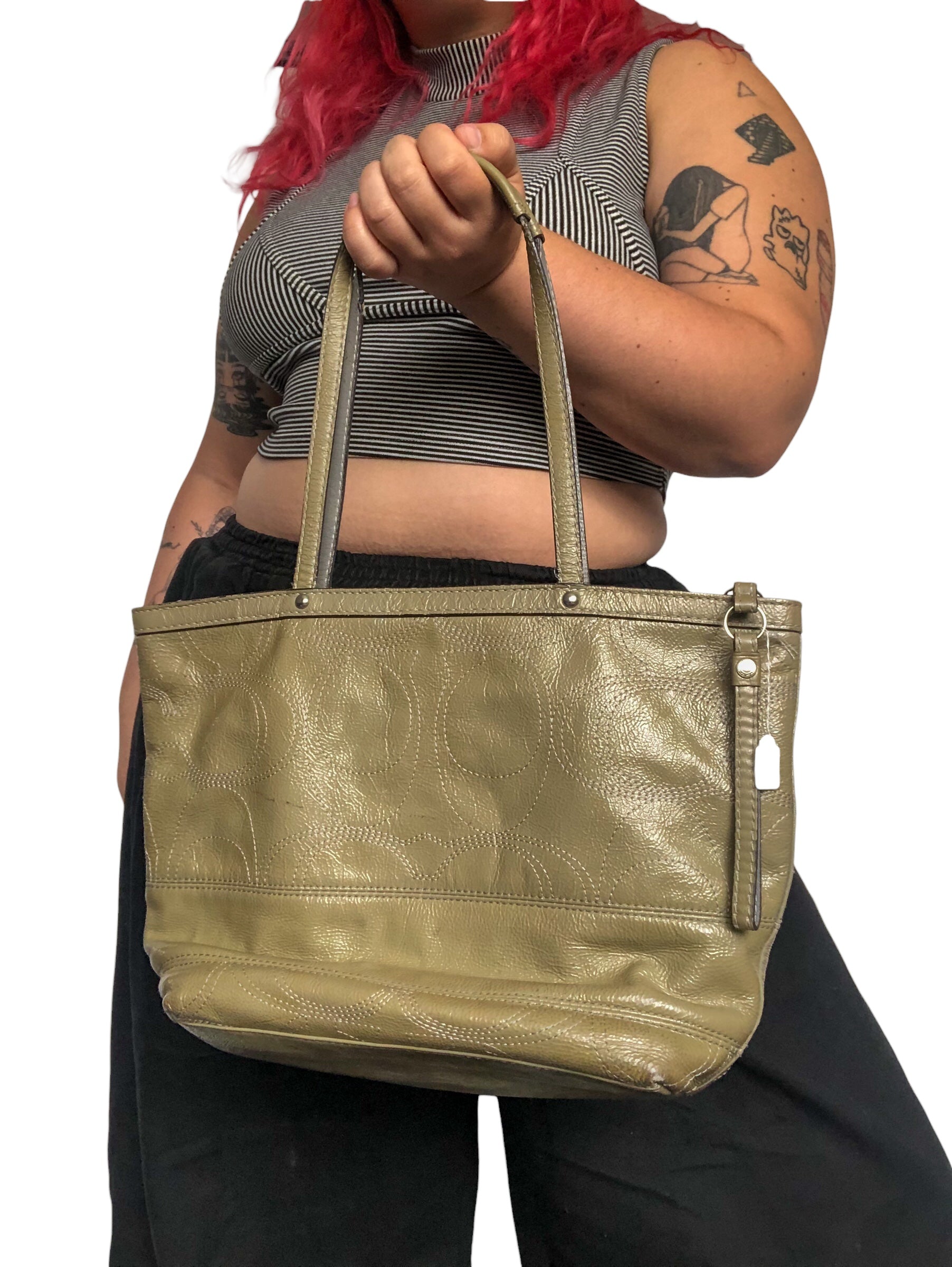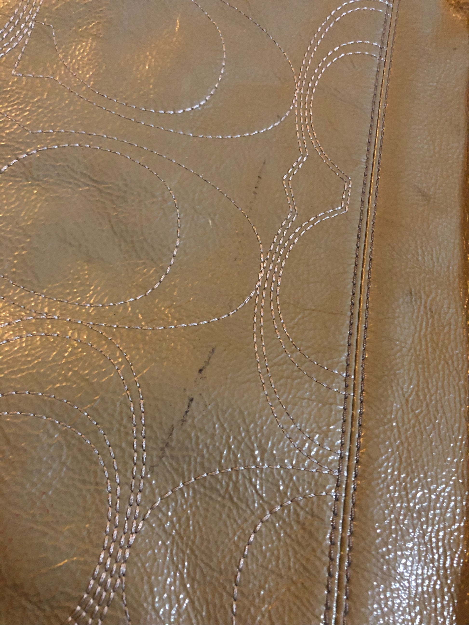 your everyday handbag~ monogram stitching throughout, zipper closure w/ leather pull, faint marking on the back (pictured)