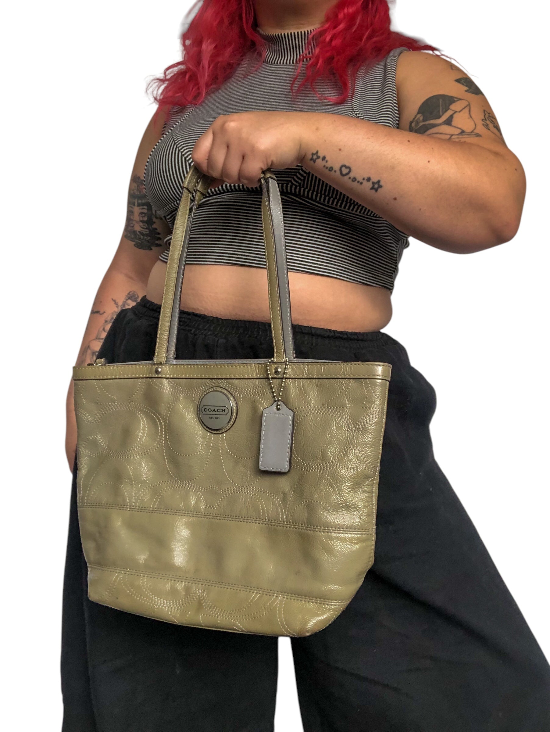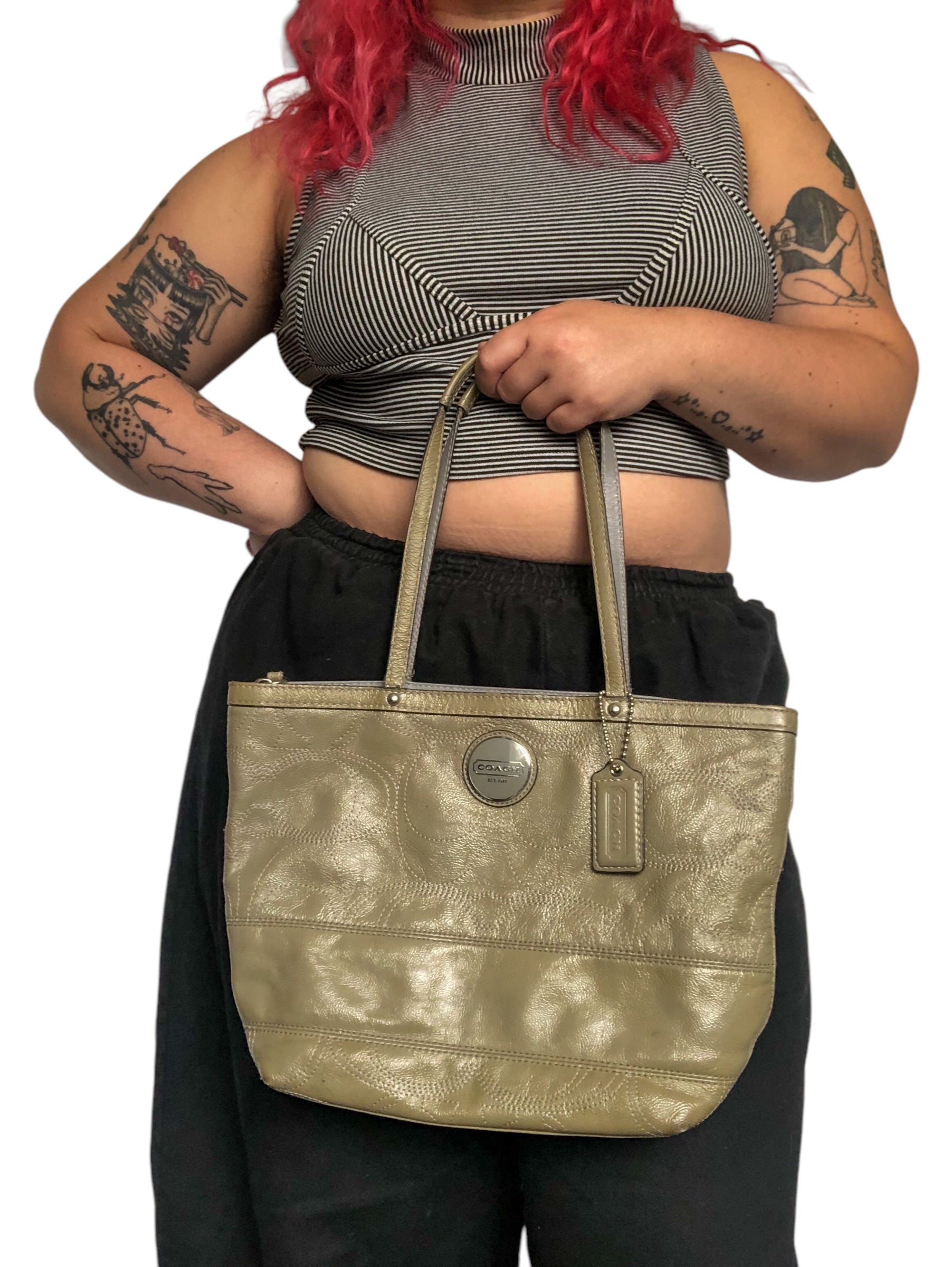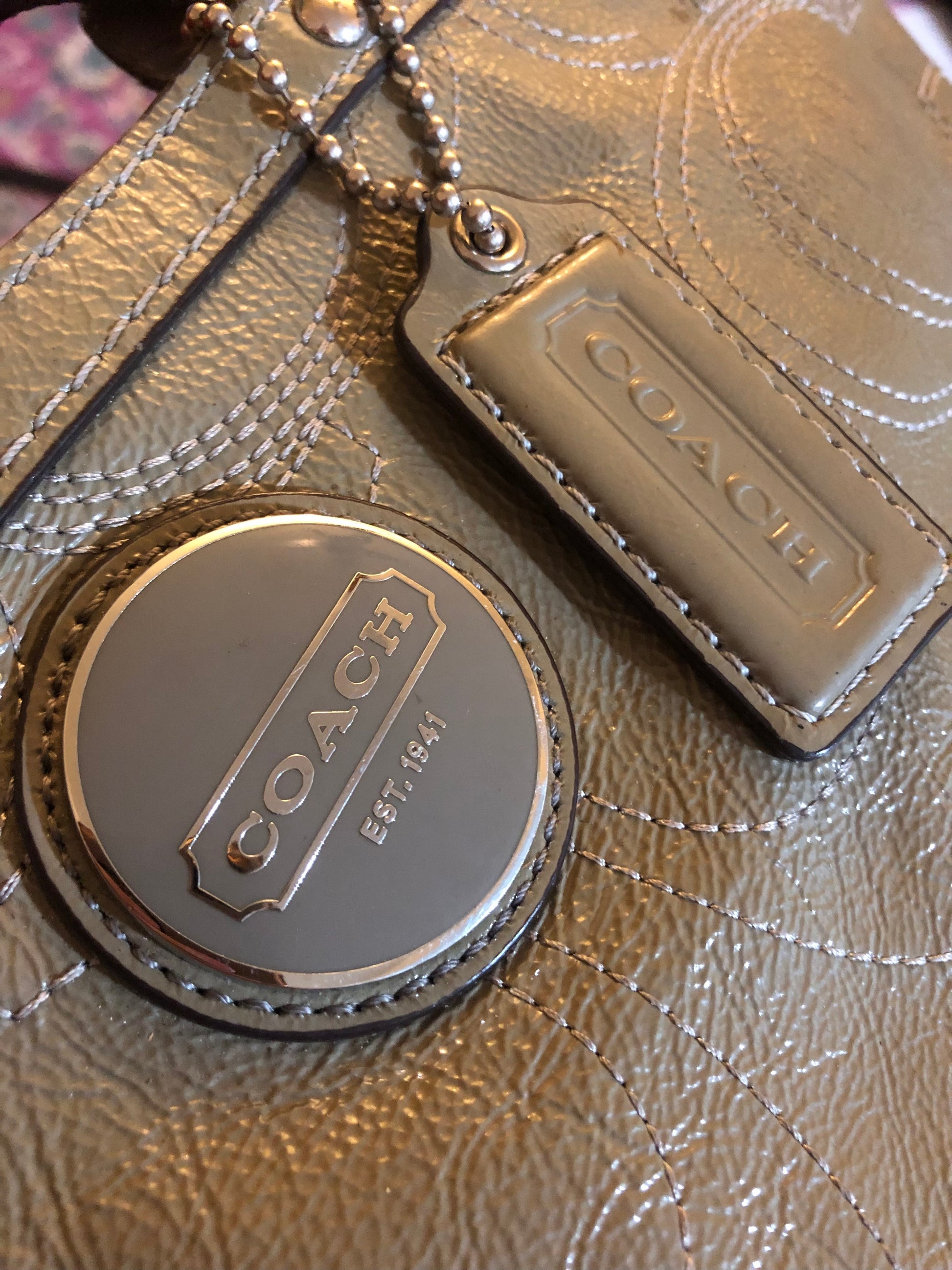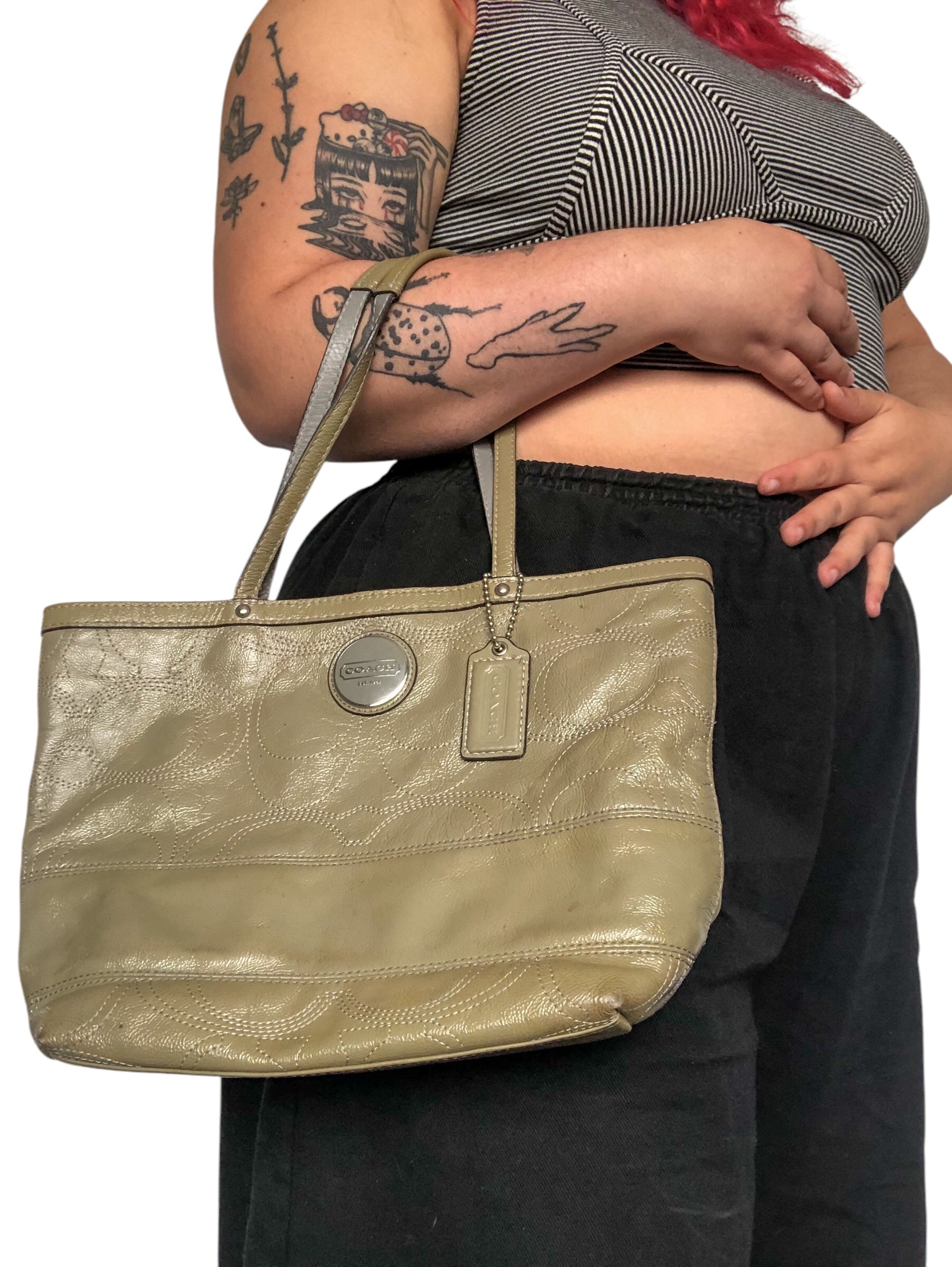 your everyday handbag~ monogram stitching throughout, zipper closure w/ leather pull, faint marking on the back (pictured)