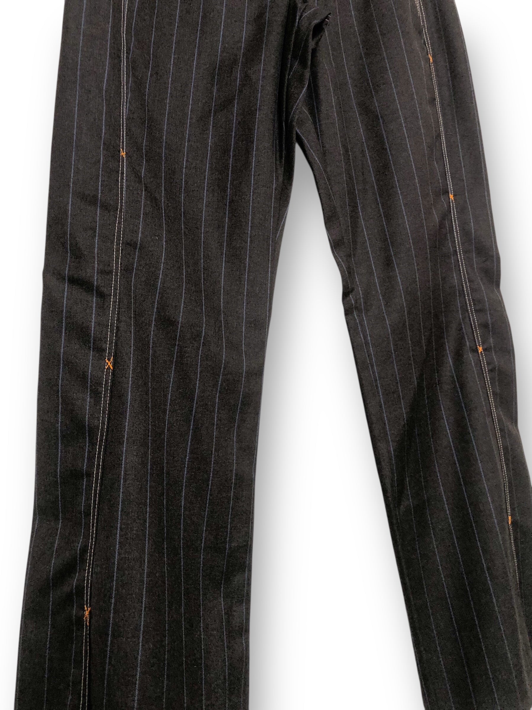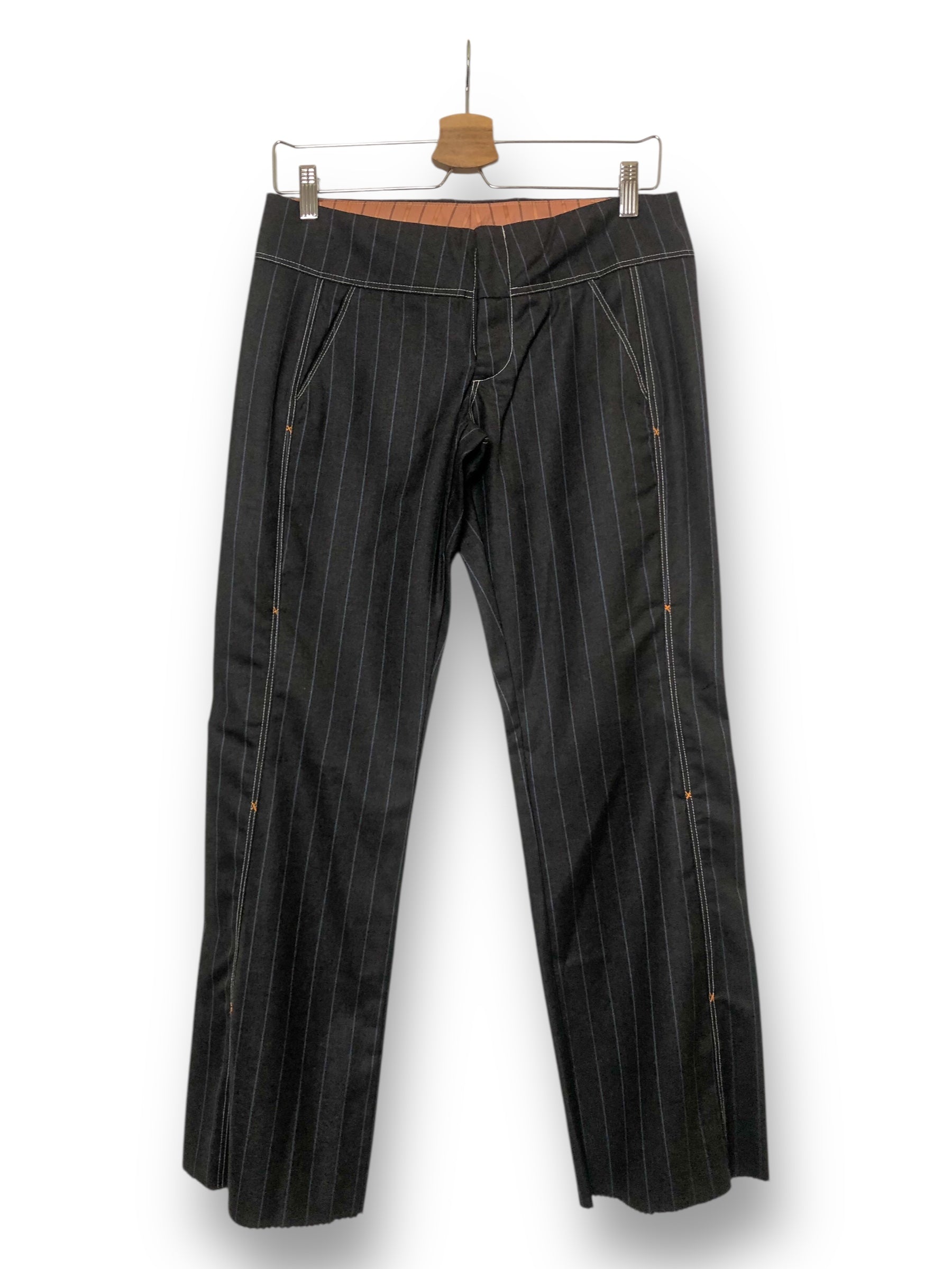 The RealReal tags - seems like a sample! white stitching throughout + orange stitch accents, front zipper + inner button closure, small front pockets, raw pant hems, feels like wool or wool blend