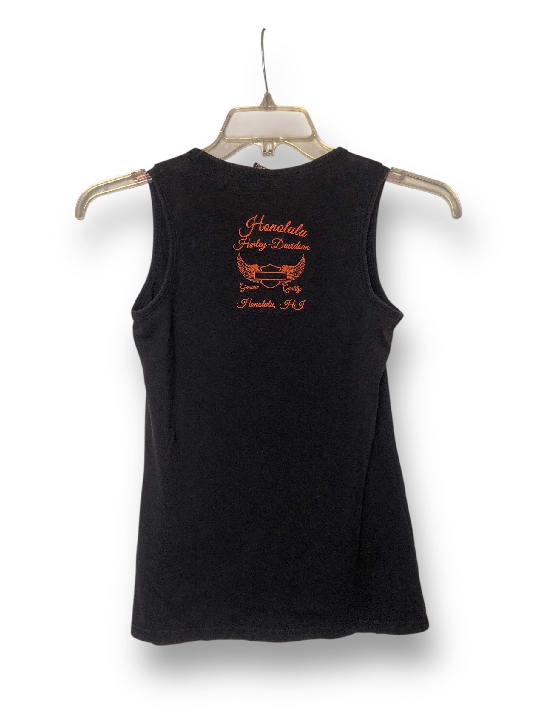 red and silver bedazzling on the front + motorcycle print, white Honolulu Hawaii print on the back, soft and stretchy (95% cotton 5% spandex)