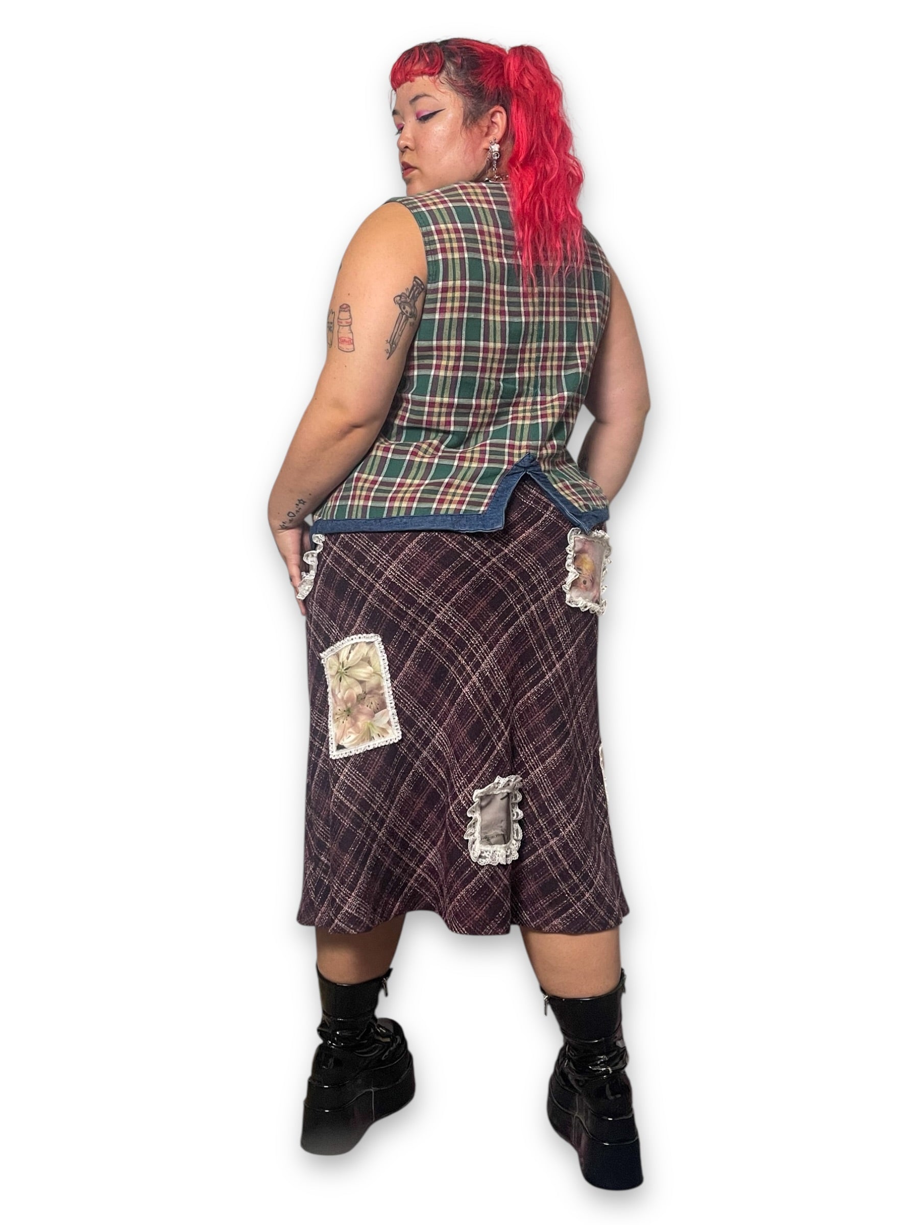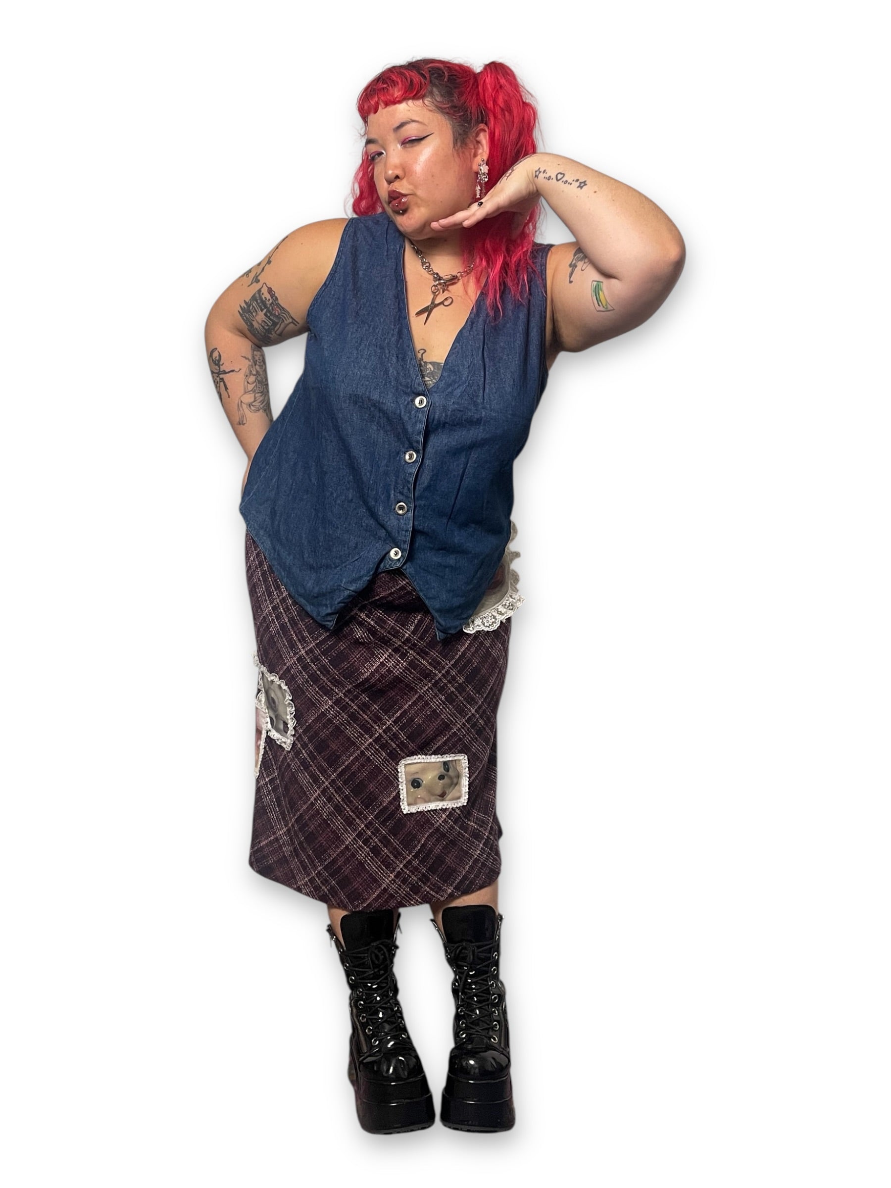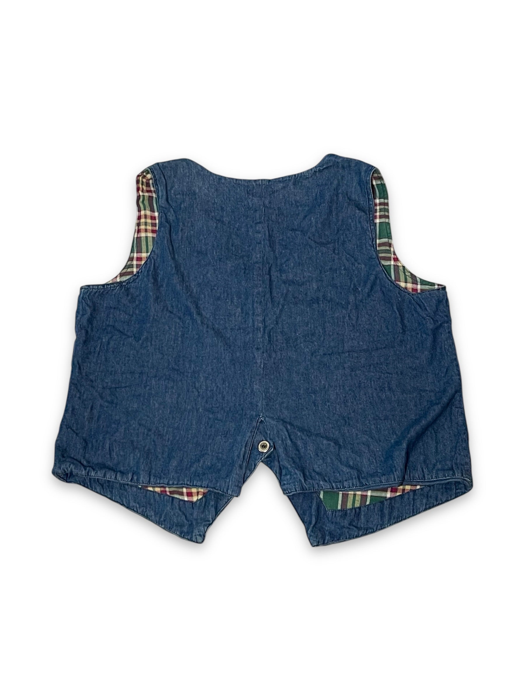 metal buttons on both sides making it reversible! dark wash denim or green and red plaid, feels like cotton, potentially handmade
