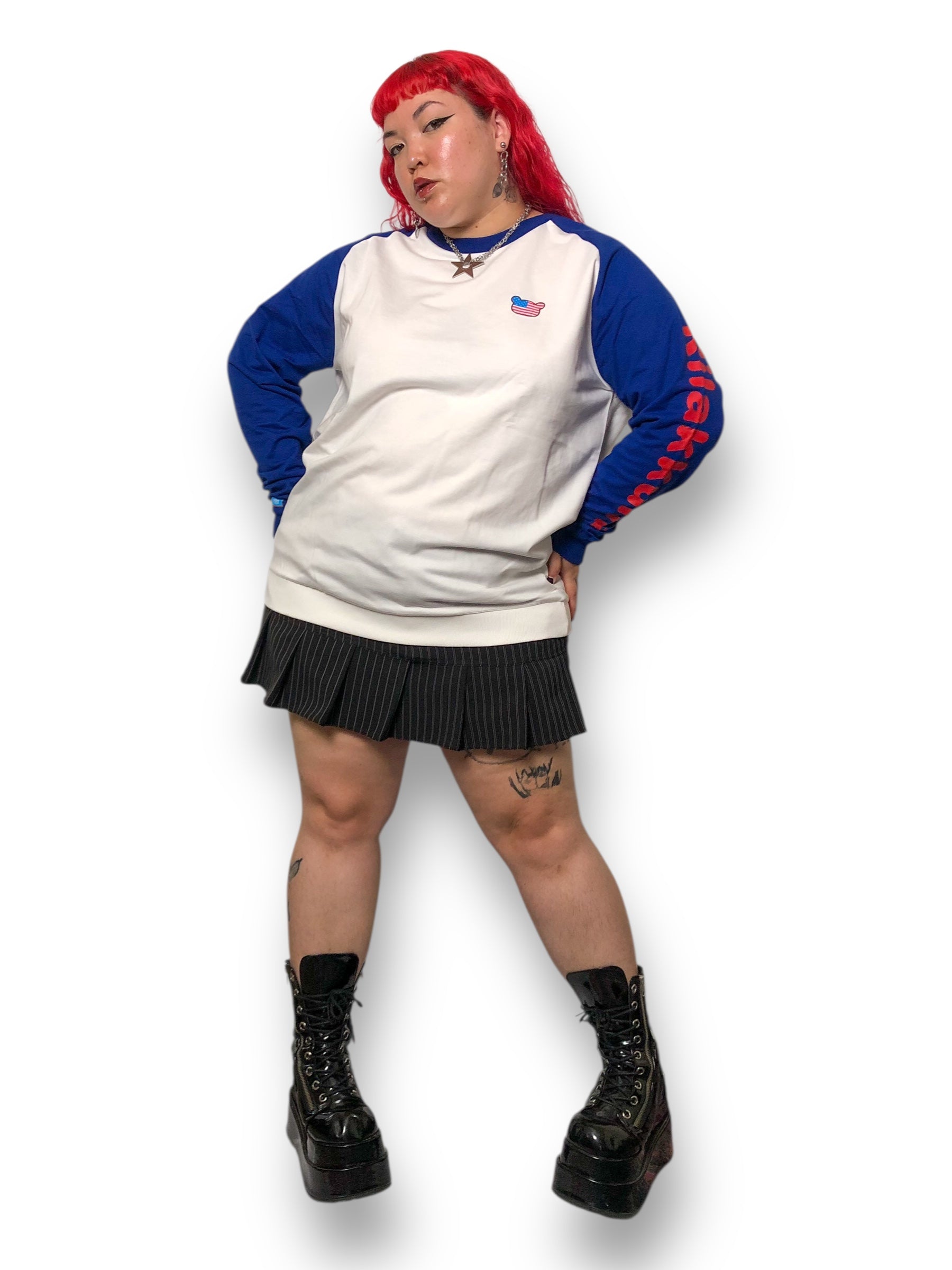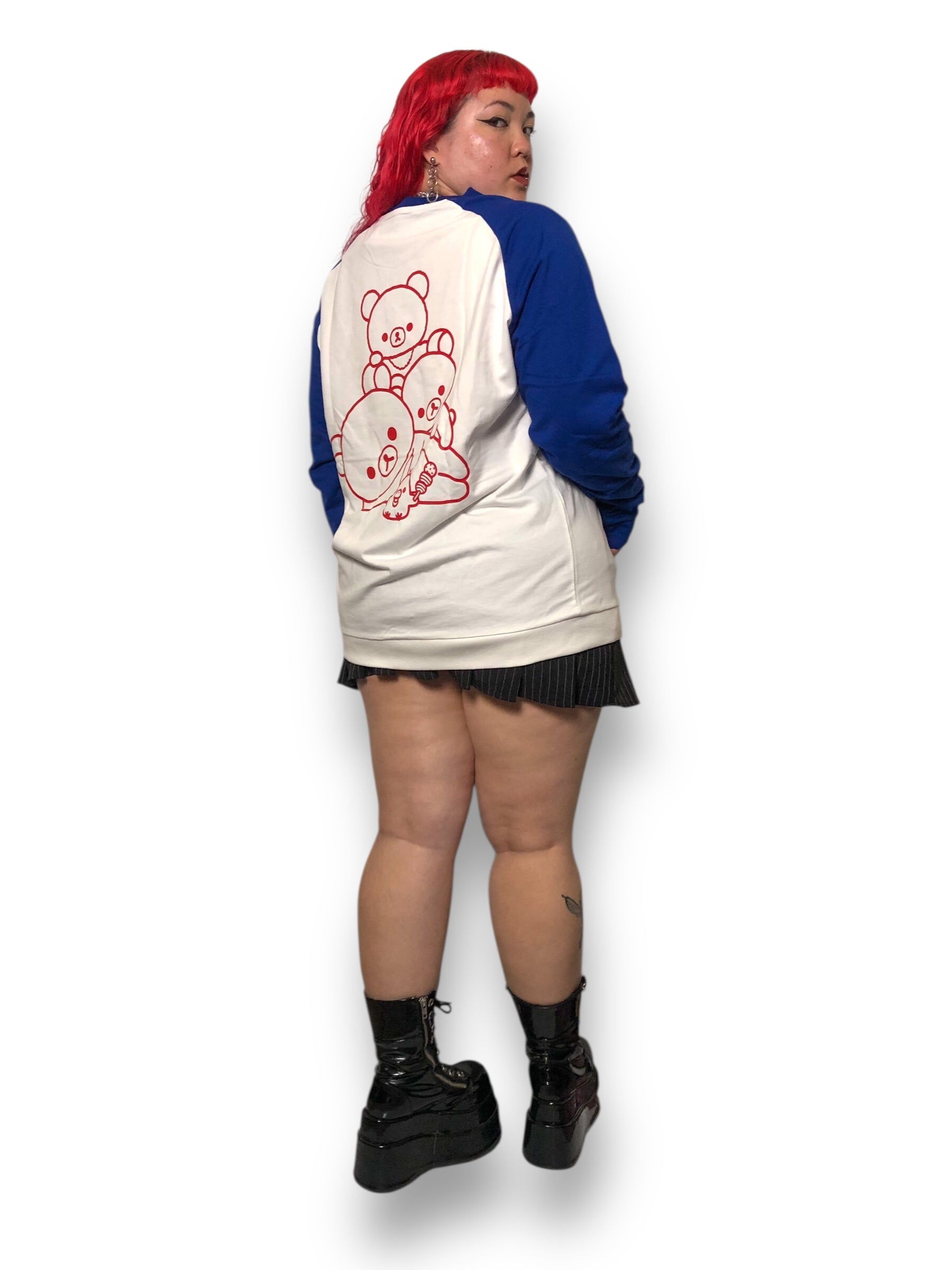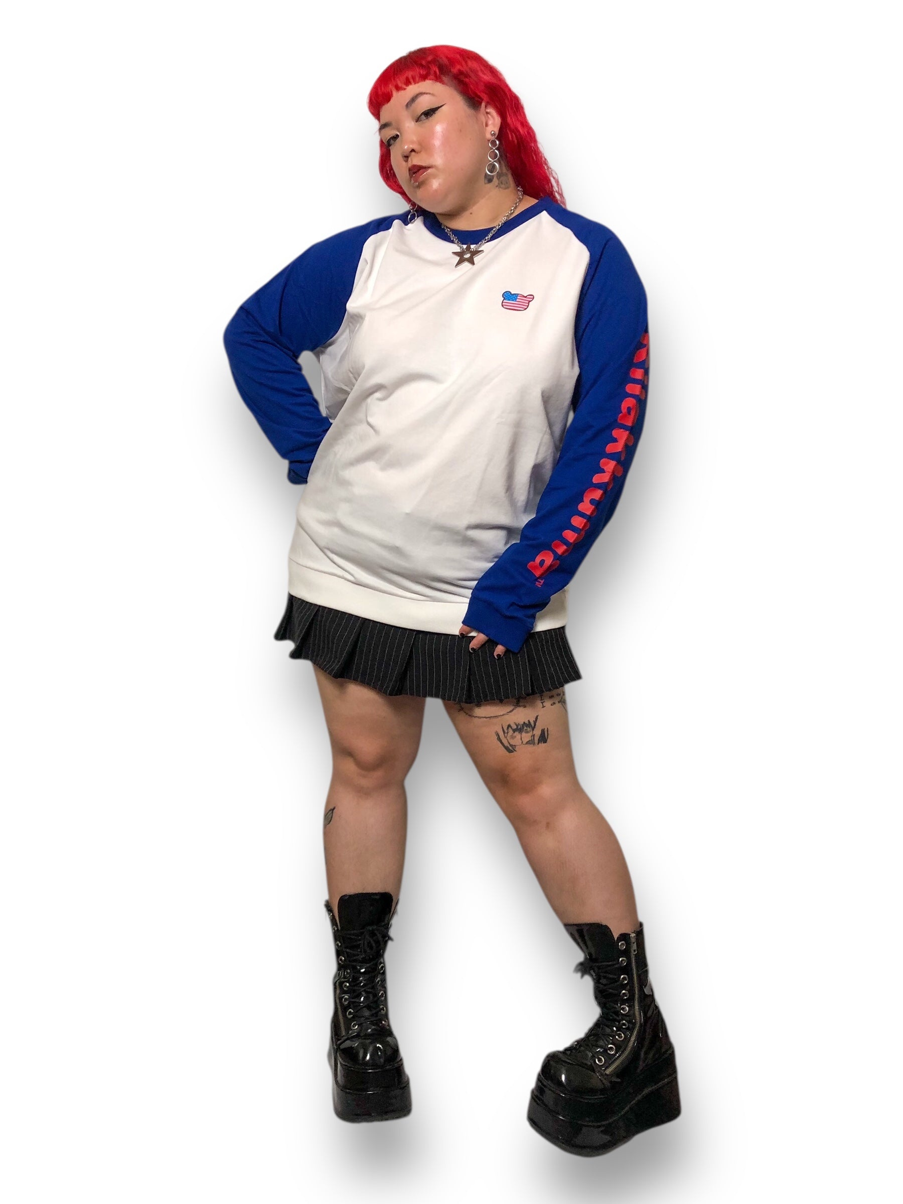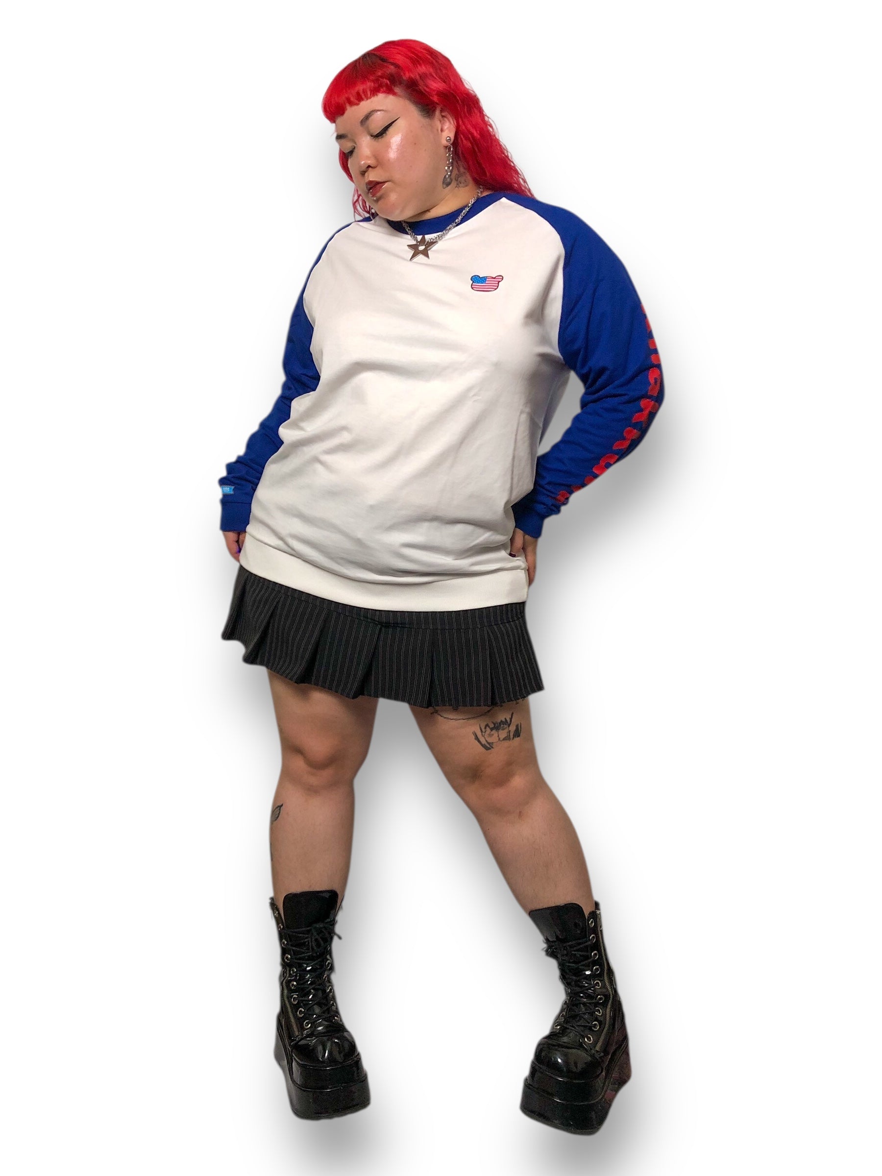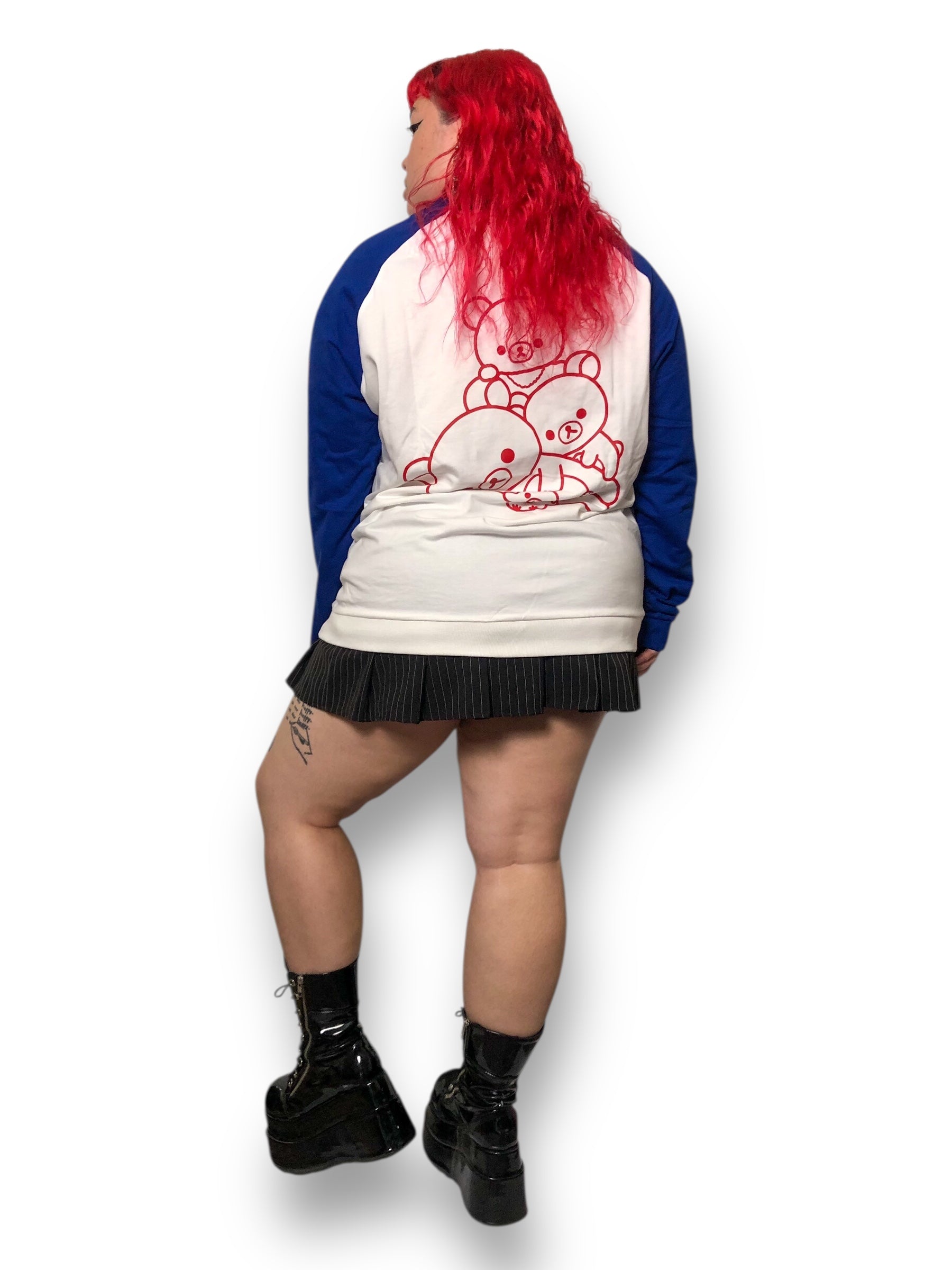 brand new official Sanrio merch w/ tags! blue raglan sleeves w/ red print on the left sleeve, American flag bear on the front, red character print on the back, stretchy rib knit cuffs + bottom hem, 60% cotton 40% polyester