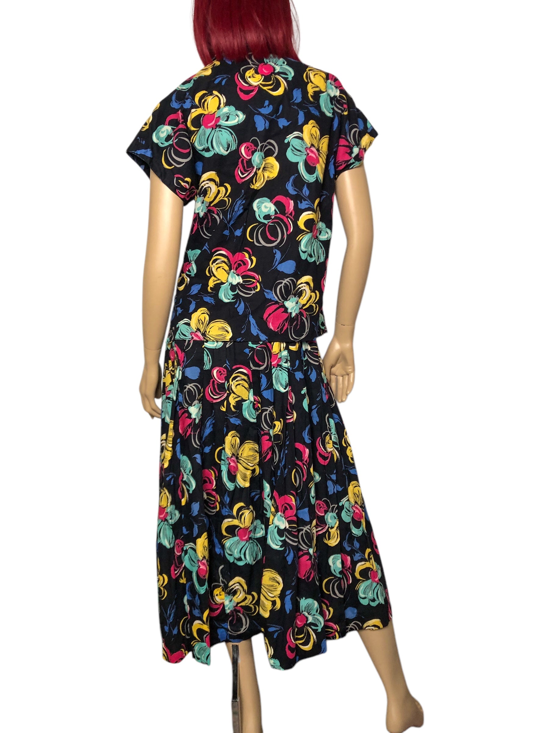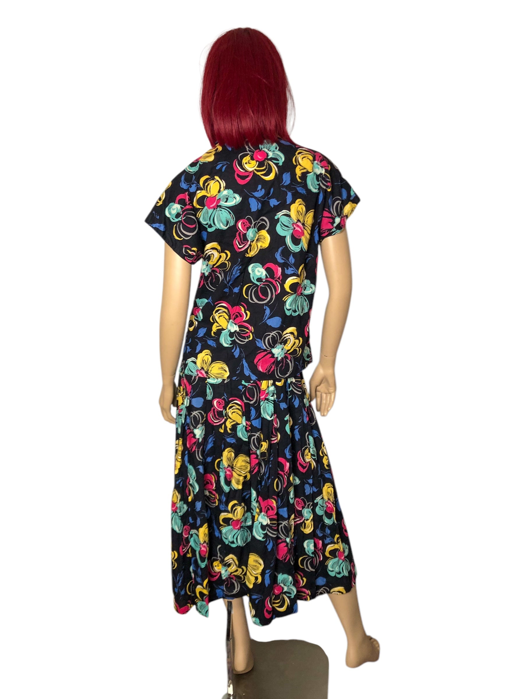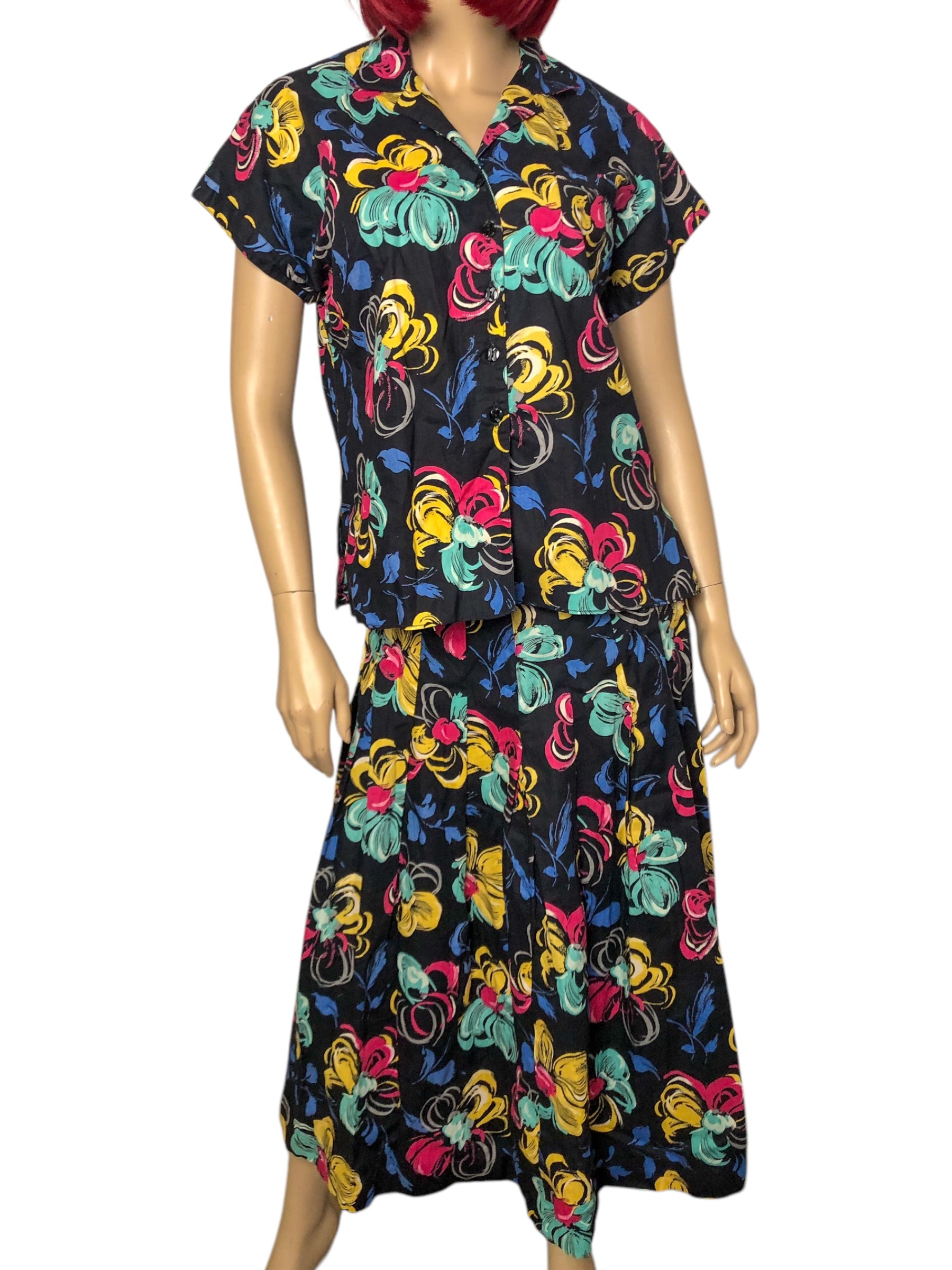 super fun rainbow retro flowers throughout! buttons down the front + shirt pocket on the blouse, pleated skirt with rear button + zipper, no stretch (feels like a poly cotton blend), single stitching, seems handmade + vintage!