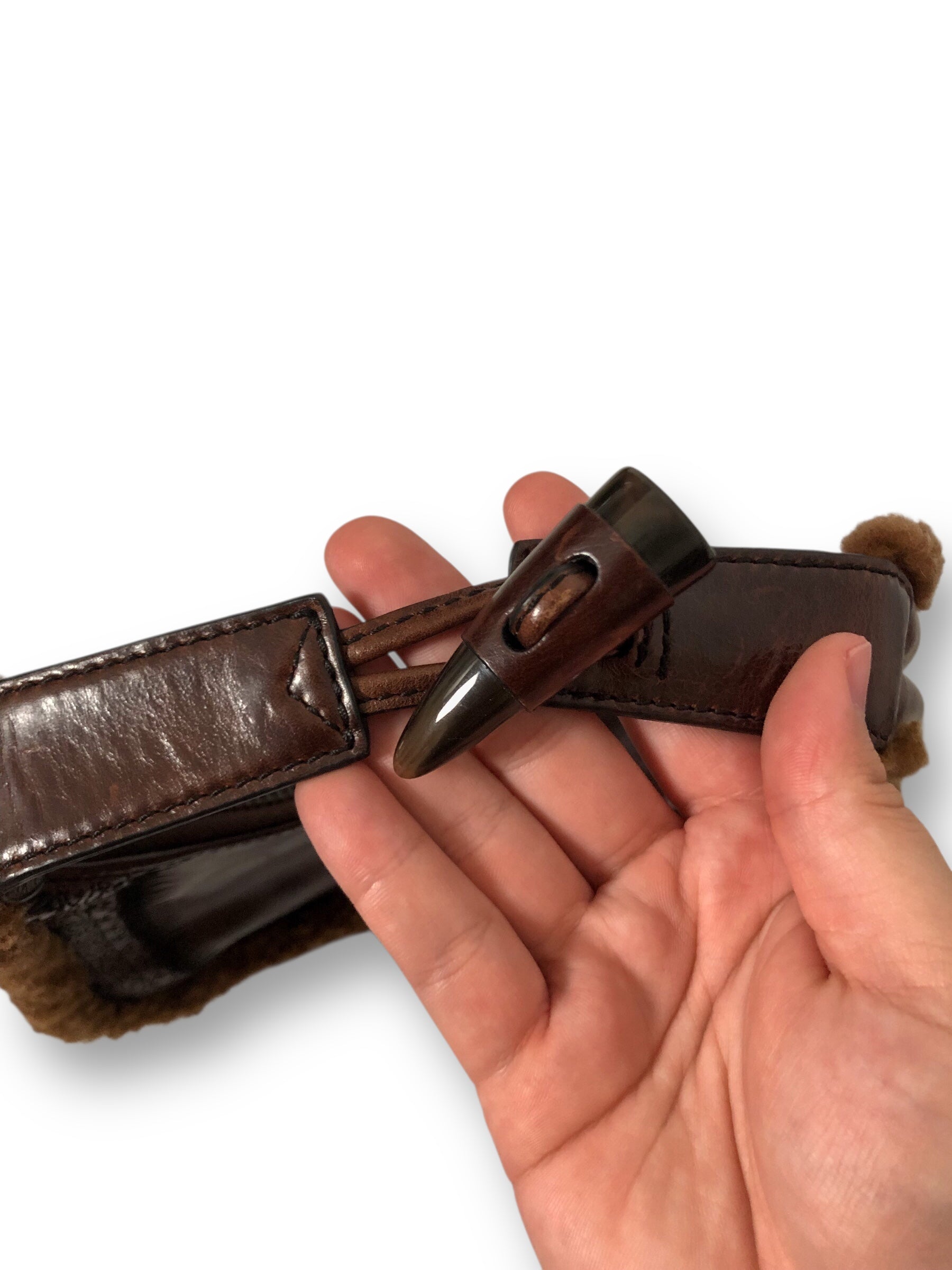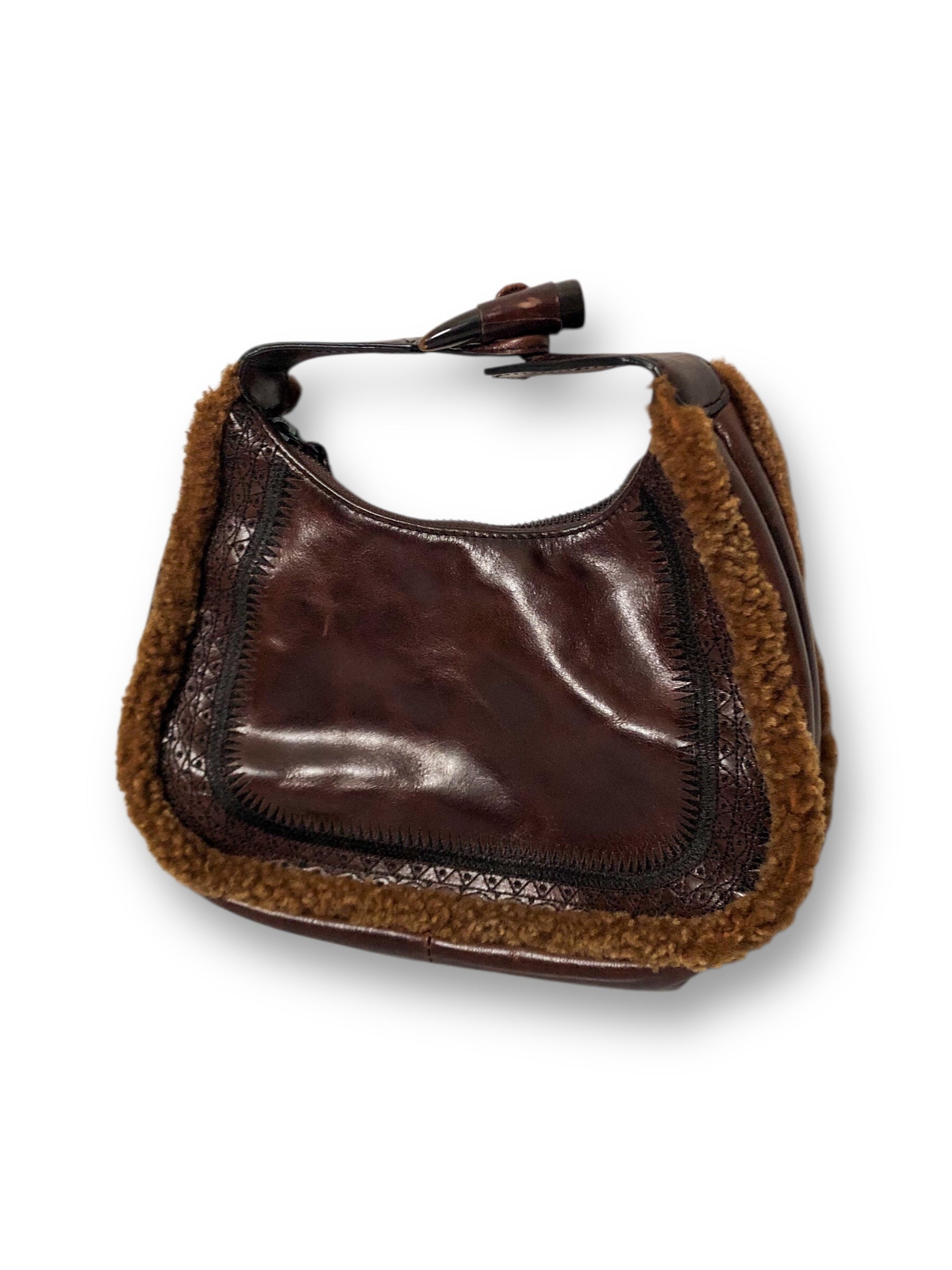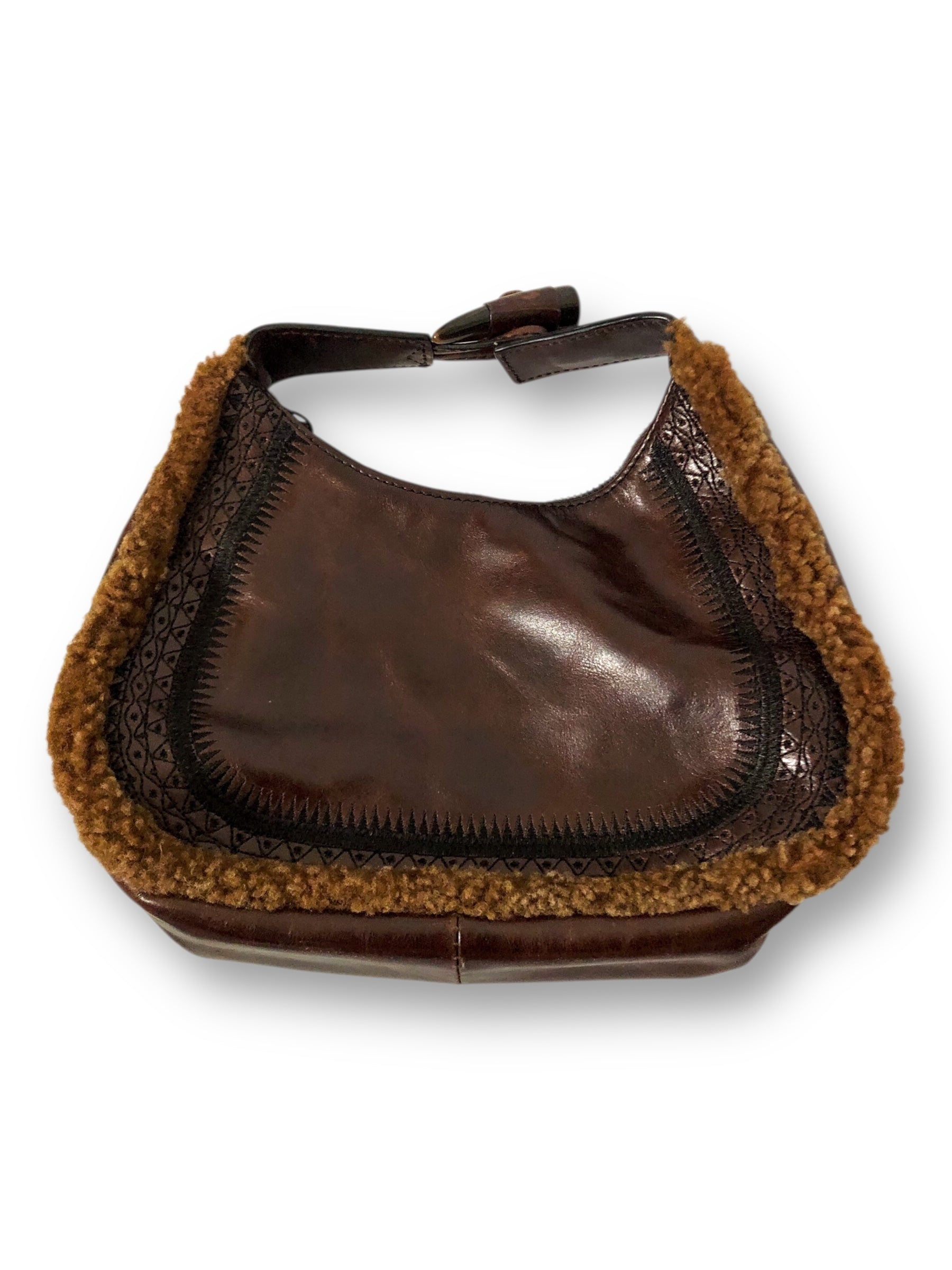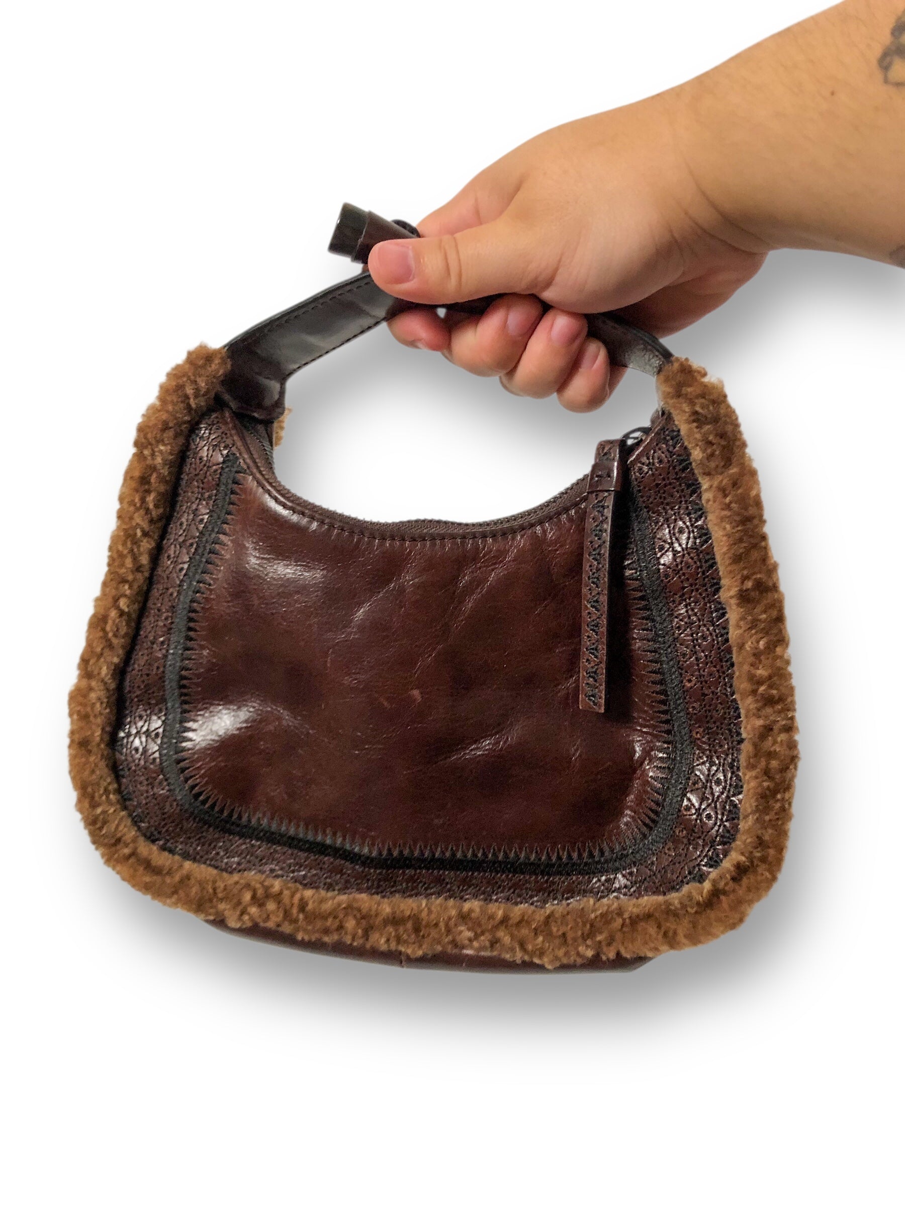 beautiful black embroidered patterns + faux fur trim ~ zipper closure, toggle clasp handle, lined, one zippered pocket, in fantastic condition!