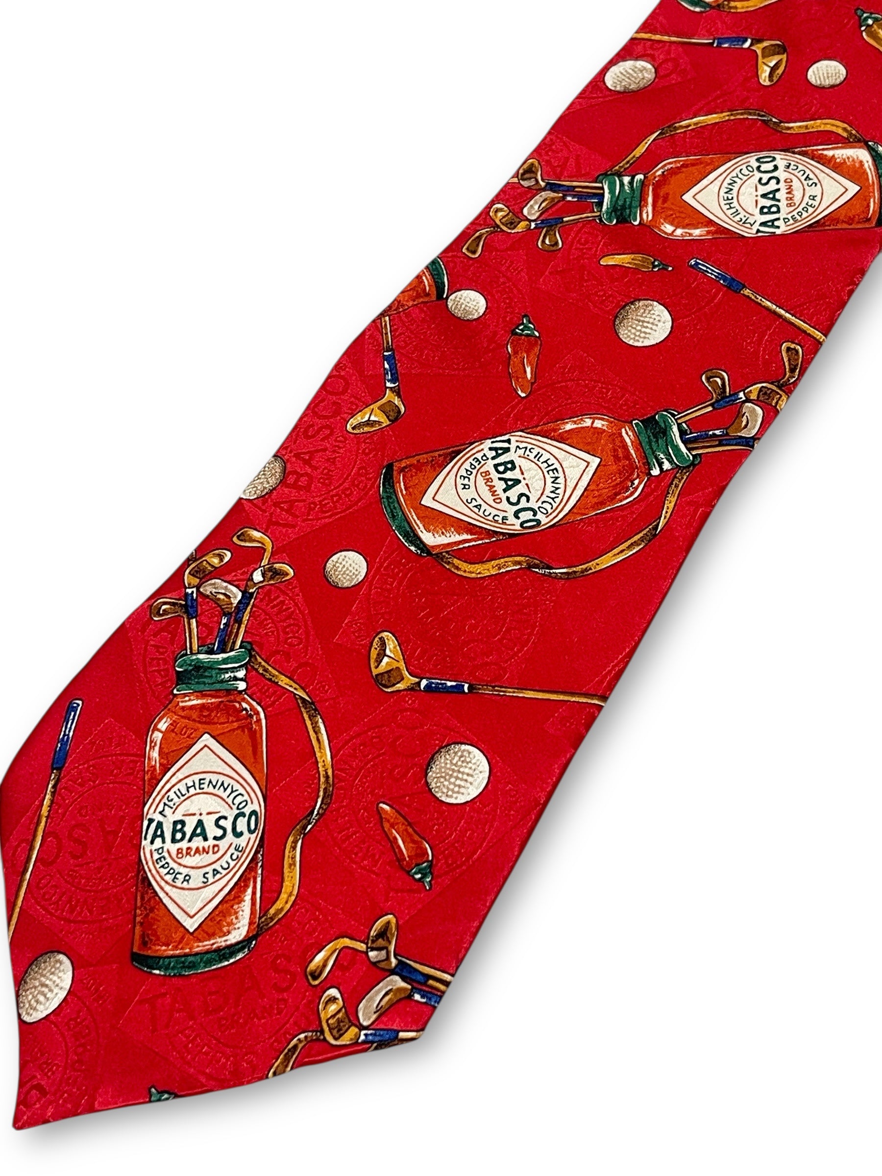 fun and chaotic chili pepper + Tabasco golf club print throughout! 100% silk, made in USA