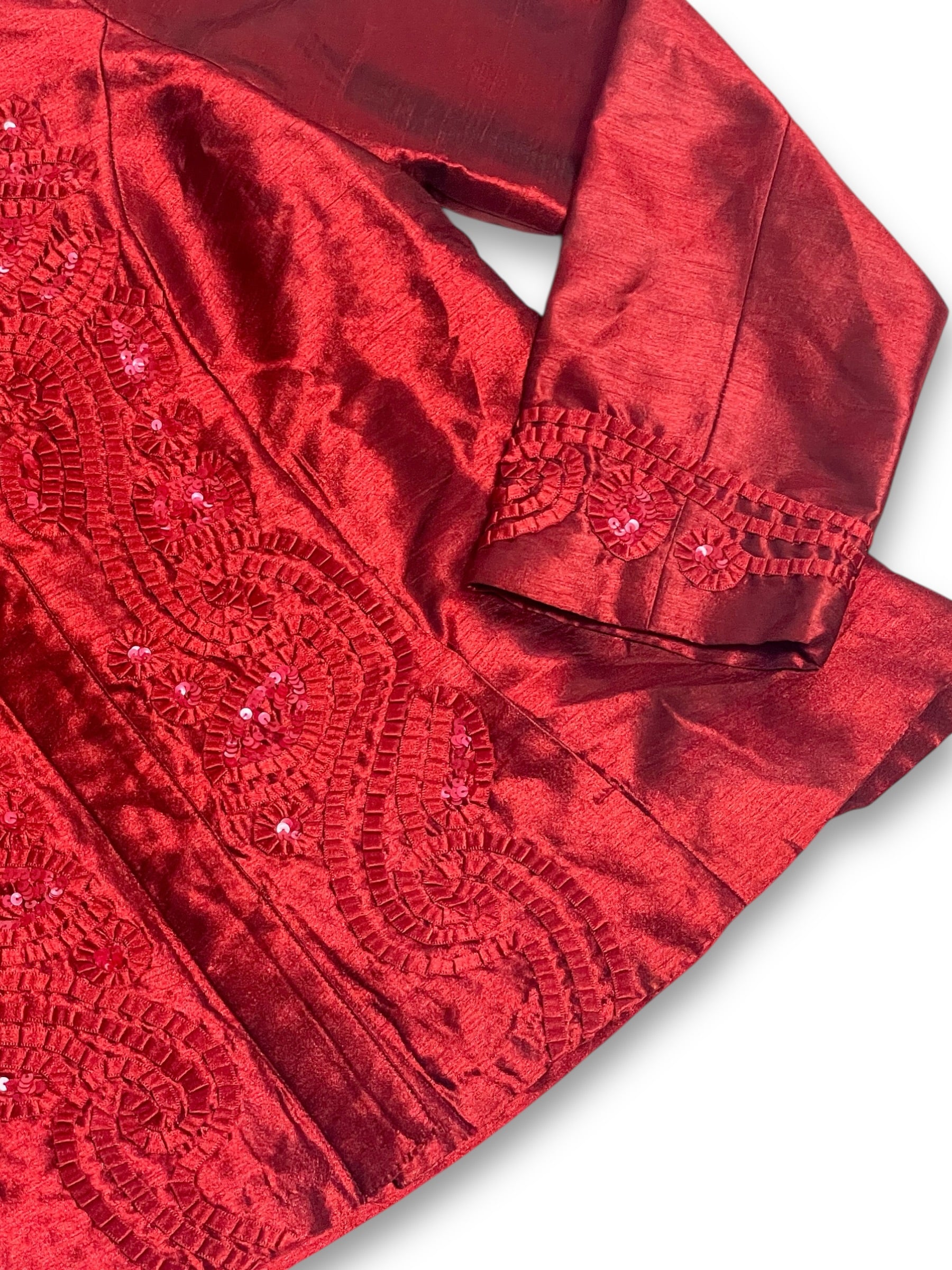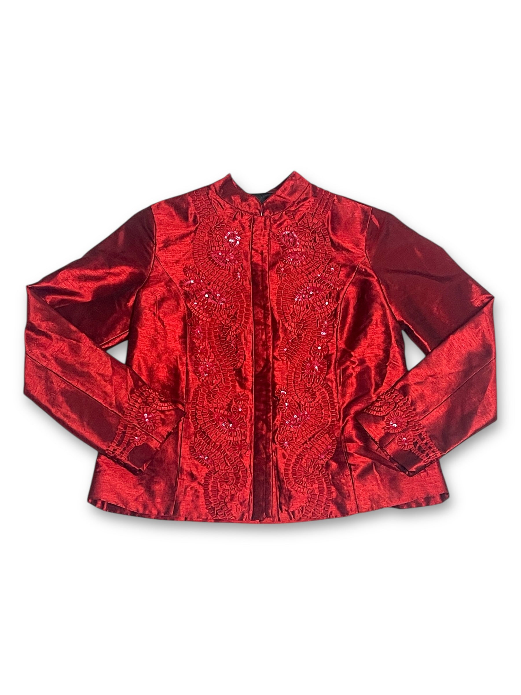 gorgeous ribbon appliqué design down the front + around the cuffs w/ sequin accents, buttons down the front, mandarin collar, front pockets, thin shoulder pads, no stretch (100% polyester)