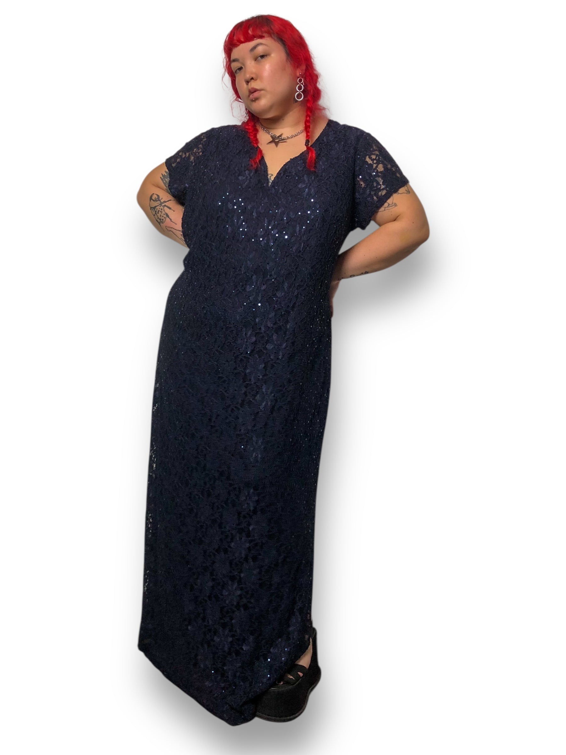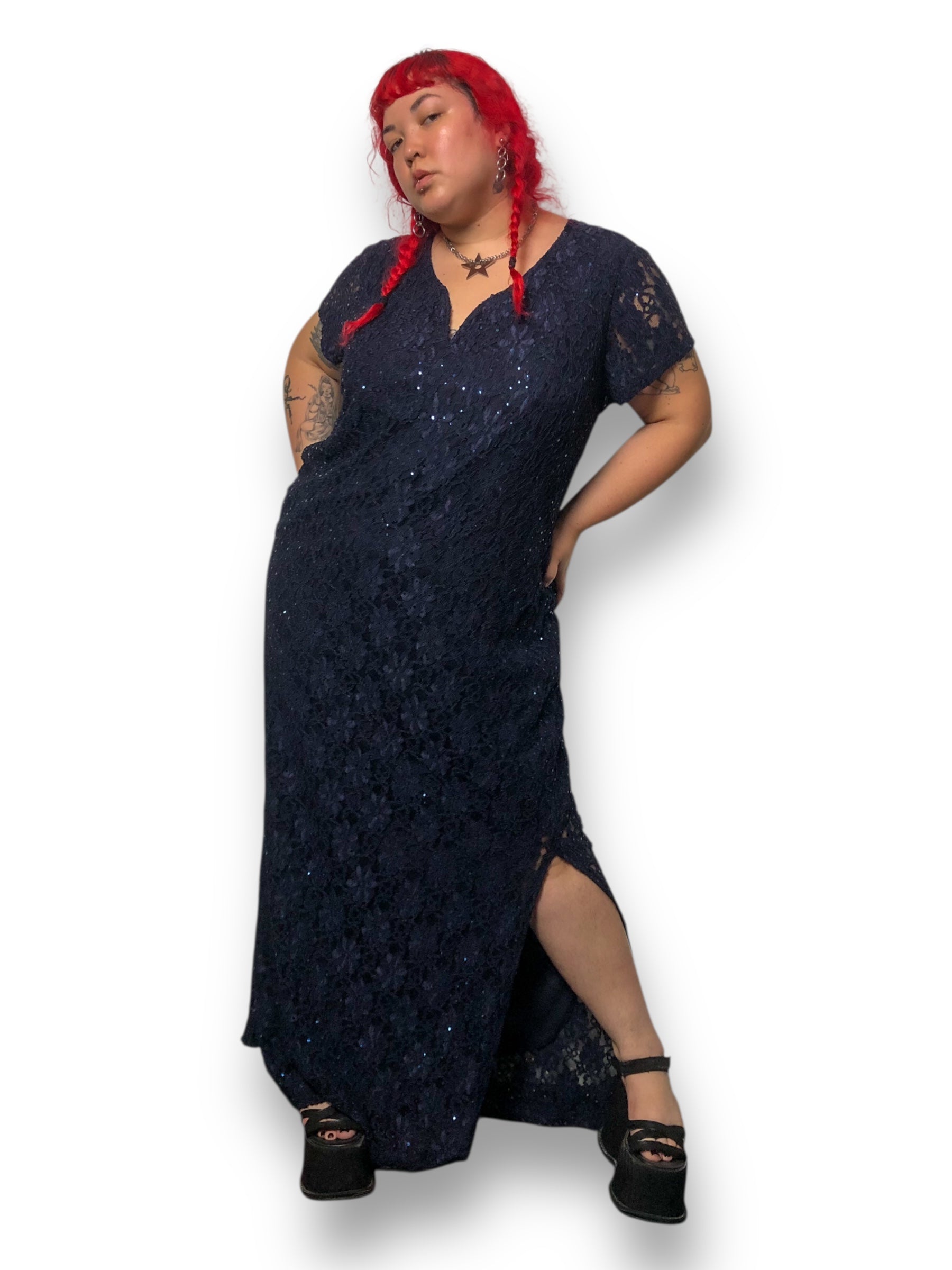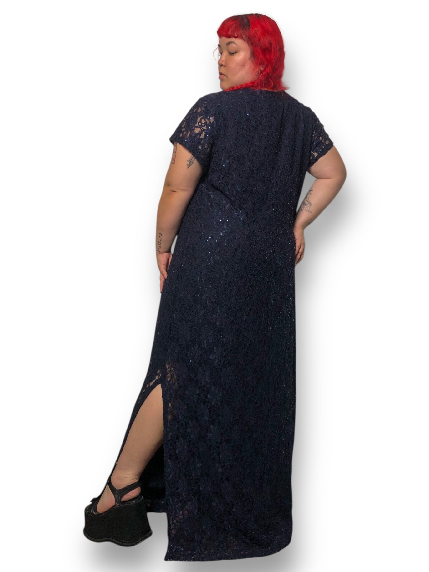 Y2K Connected Navy Blue Floral Lace Evening Dress (3X)