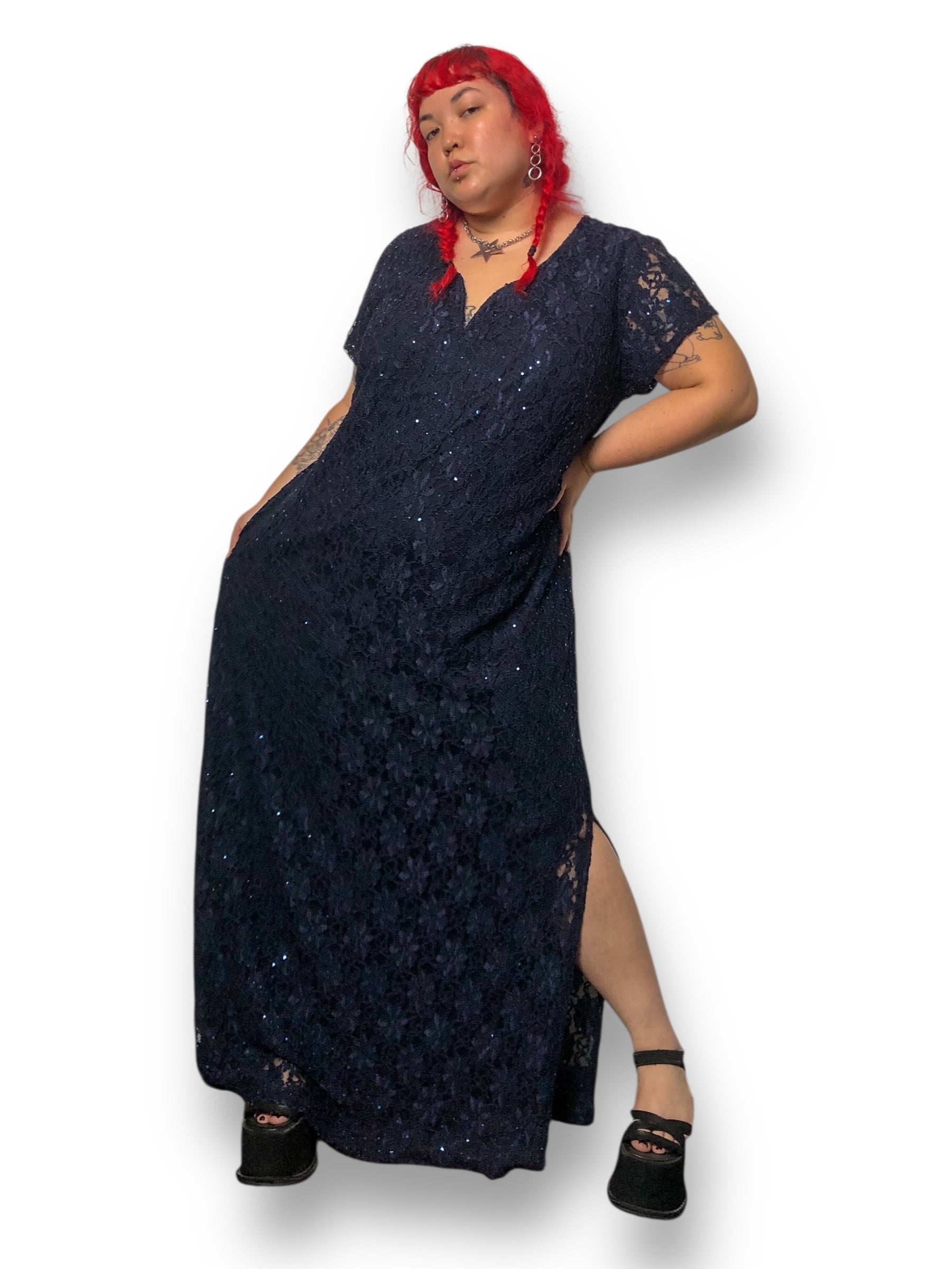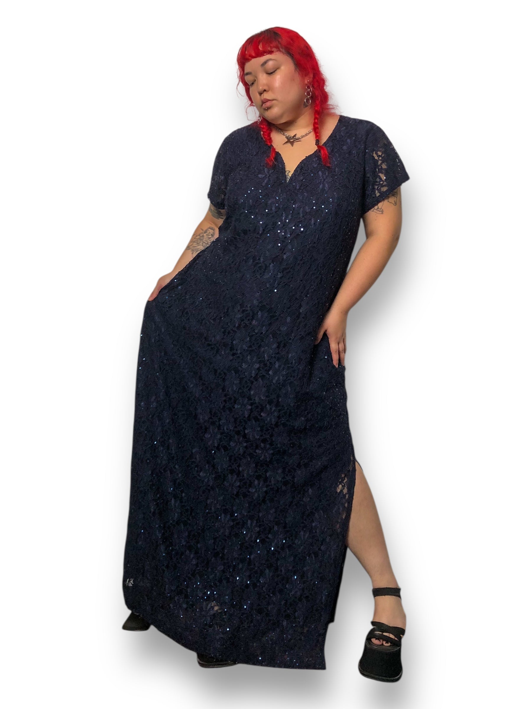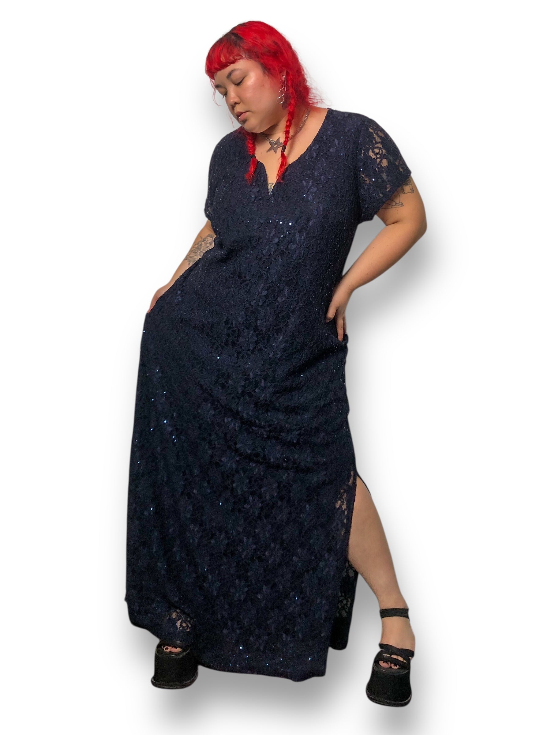 Y2K Connected Navy Blue Floral Lace Evening Dress (3X)