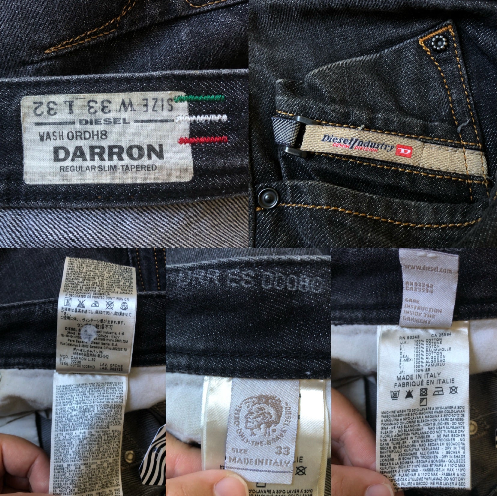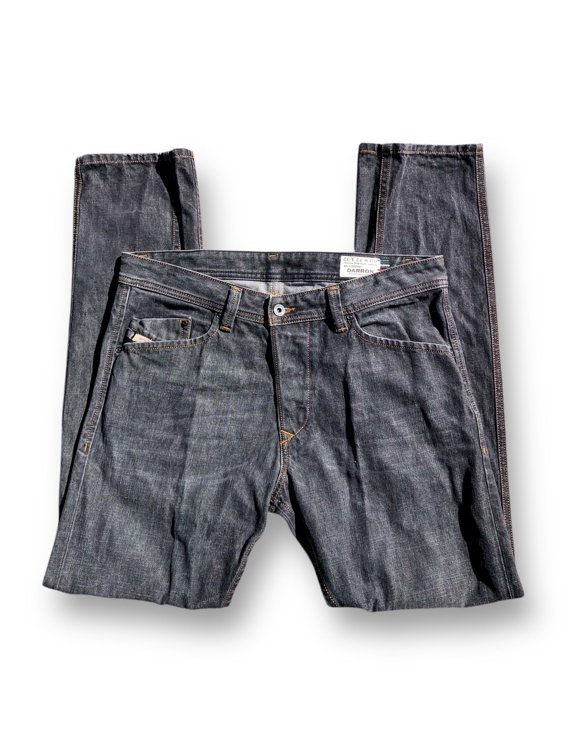 regular slim-tapered fit! cool brown stitching on the rear pockets, button fly, ‘Diesel Industry Denim Division’ buckle tag on the right front pocket, 100% cotton denim, made in Italy