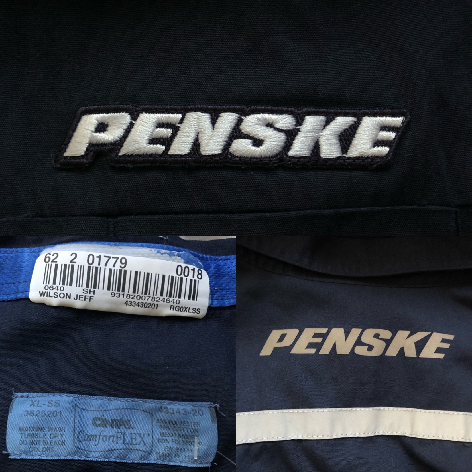 ‘Penske’ uniform shirt with a ‘Jeff’ name tag, shirt pockets, gray reflective trim, minimal stretch throughout (65% polyester 35% cotton) + mesh panels (100% polyester), brand is Cintas ComfortFlex