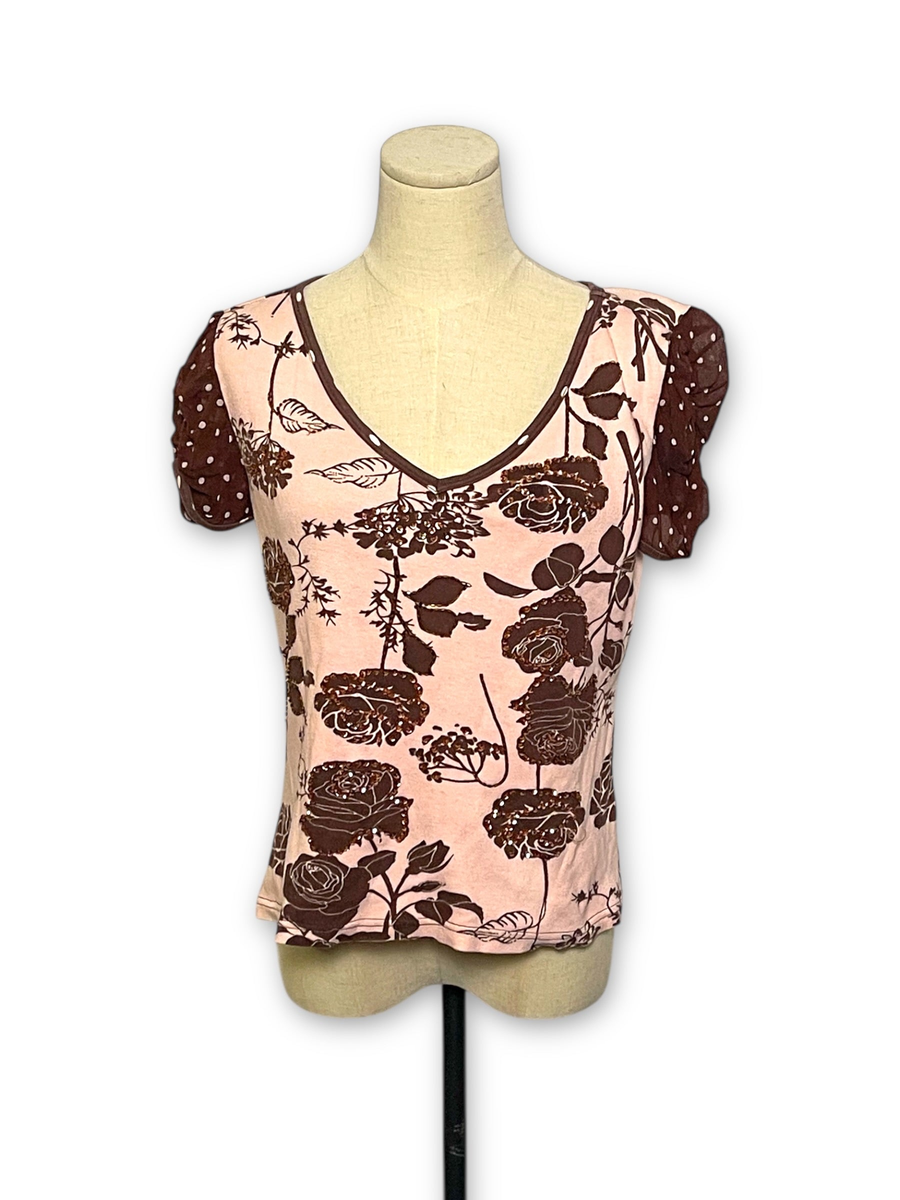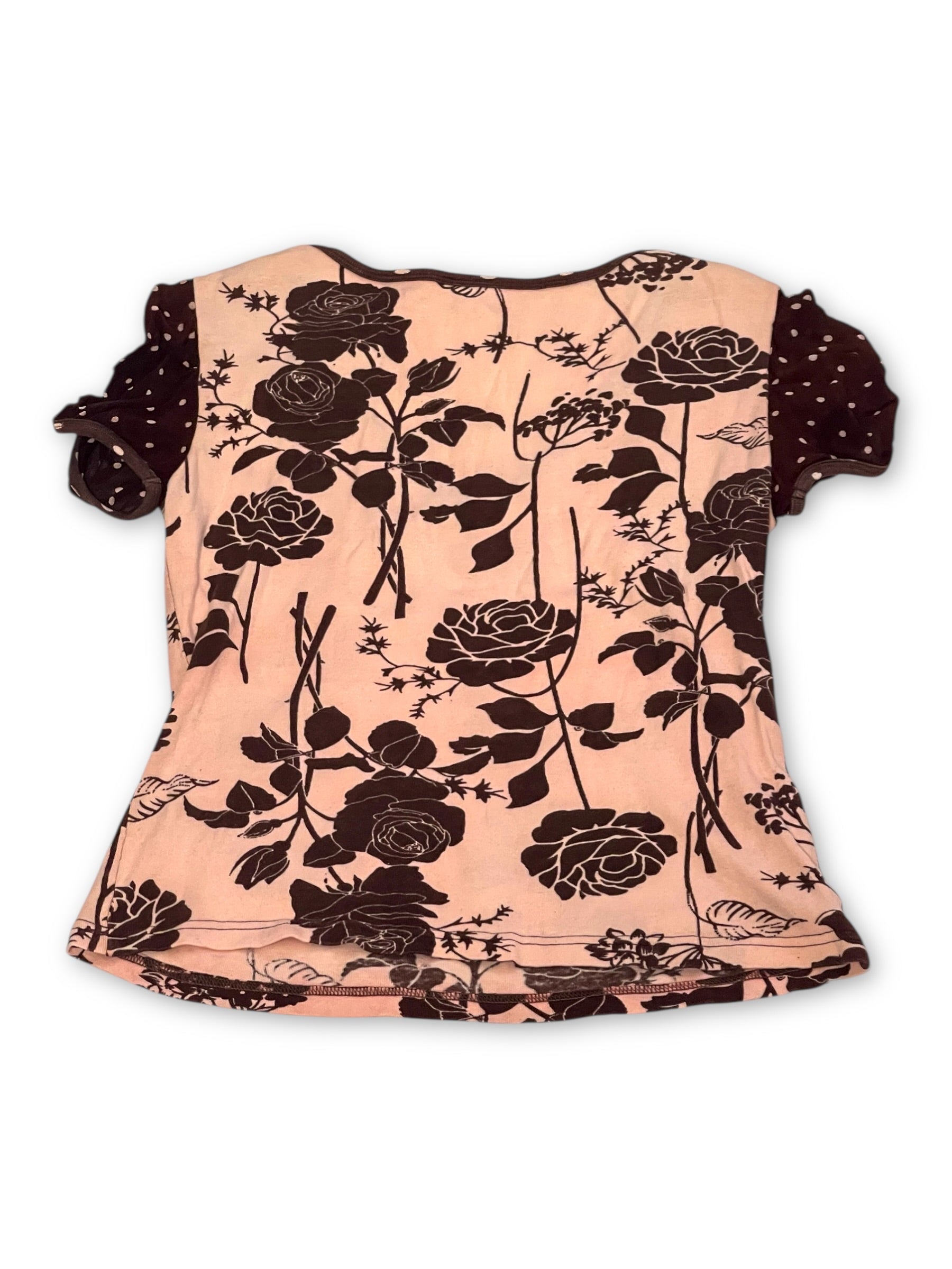 Y2K Pink and Brown Floral Print Top (S/M)